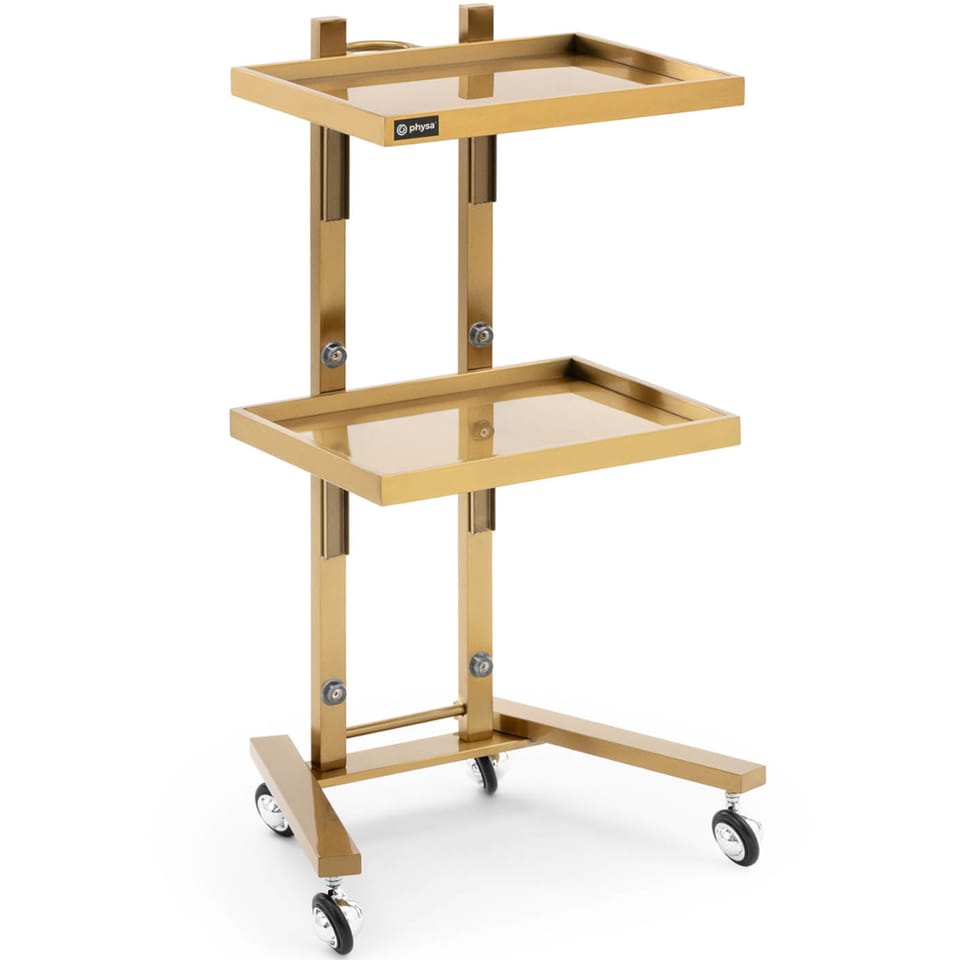 Kod producenta: 10040686Wózek marki Physa sprawdzi się w salonie kosmetycznym, fryzjerskim a także w prywatnej łazience do utrzymywania w porządku kosmetyków, środków czystości czy innych podręcznych akcesoriów. Może zostać użyty także w kuchni czy jako stolik nocny w sypialni. Wózek posiada 4 płynnie poruszające się kółka. 2 półki z obrzeżami zapewniają wystarczającą ilość miejsca na podręczne przybory oraz chronią przedmioty przed upadkiem. Nośność pomocnika wynosi 10 kg. Rama wózka wykonana została ze stali nierdzewnej, jest odporna na czynniki zewnętrzne, wytrzymała i stabilna. Złoty kolor doda gracji każdemu pomieszczeniu.Cechy produktu: