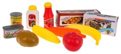 | - koszyk z rączką i uchwytem, - banan, - marchewka, - kukurydza, - ziemniak, - pomidor, - ketchup, - konserwa, - sok owocowy, - pudełko ciastek, - pudełko z kawą, - puszka z brzoskwiniami. |