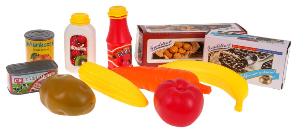 | Wymiary | - koszyk w najniższej pozycji ok. 36 cm x 28,5 cm x 18,5 cm, - koszyk w najwyższej pozycji ok. 57 cm wysokości, - średnica kółka ok. 6,5 cm, - banan ok. 17 cm x 6 cm x 3,5 cm, - marchewka ok. 17,5 cm x 4 cm, - kukurydza ok. 14,5 cm x 3,5 cm, - ziemniak ok. 8,5 cm x 6 cm, - pomidor ok. 6,5 cm x 5,5 cm, - ketchup ok. 11 cm x 4 cm, - konserwa ok. 7 cm x 4 cm x 7,5 cm, - pudełko ciastek ok. 17 cm x 6,5 cm x 5 cm, - pudełko z kawą ok. 13 cm x 7 cm x 4 cm, - sok owocowy ok. 9,5 cm x 5 cm x 4 cm, - puszka z brzoskwiniami ok. 6,5 cm x 4,5 cm |