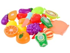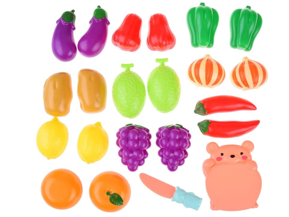 Duży wózek na zakupy wypełniony warzywami to idealny sprzęt do zabawy w sklep. Dzieci uwielbiają naśladować dorosłych w codziennych czynnościach, dlatego ten super wózek z warzywami przypadnie do gustu każdemu małemu smykowi. Wózek w całości wykonany jest z plastiku, ma szerokie koła wygodną rączkę do prowadzenia.Warzywa/owoce także są plastikowe w atrakcyjnych kolorach. Złączone są rzepką, dzięki czemu dziecko będzie mogło bawić się w krojenie ich.Zestaw zawiera:- głęboki wózek na szerokich kołach,- deska do krojenia w misiowym kształcie,- nóż do krojenia z misiową rączką,- cebula,- ziemniak,- papryka zielona,- bakłażan,- papryczka chili,- pomarańcza,- cytryna,- winogrono,- kiwi,- owoc tropikalny czapetka samarangijska.Wymiary:- wózek: wys. 41 x szer. 18 x głęb. 16 cm,- owoc cytryna 6 x 4,5 x 5 cm,- warzywo ziemniak 6,5 x 4,5 x 5 cm,- deska do krojenia 10 x 8 x 1,5 cm,- nóż dł. 9,5 cm.Zabawy w kupowanie, sprzedawanie, krojenie, gotowanie, to są czynności, jakie dzieci często chcą wykonywać po obserwacji swoich rodziców. Zabawa w krojenie oswoi dziecko z przyrządem jakim jest nóż. Dzięki przyklejonym rzepkom, zabawkowy owoc/ warzywko łatwo się rozpoławia, a dziecko uczy się krojenia.Plastikowe, kolorowe owoce, warzywa są bardzo atrakcyjnie wykonane, zapewnią dziecku wiele pomysłów do zabaw, wystarczy tylko użyć wyobraźni.Zestaw zapakowany w kolorowe, efektowne opakowanie, które świetnie nada się na prezent. W sklepie Jokomisiada znajdziecie Państwo bardzo duży wybór edukacyjnych zabawek.