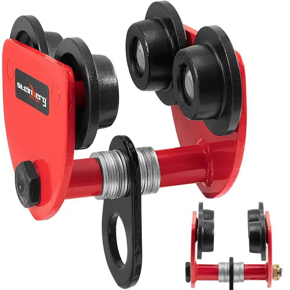 Kod producenta: 10030650Wózek suwnicowy marki Steinberg pozwala łatwo przenosić ciężkie ładunki do 1000 kg. Konstrukcja urządzenia wykonana została ze stali węglowej. Powłoka chroni urządzenie przed korozją. Wózek odznacza się współczynnikiem bezpieczeństwa 1x w oparciu o maksymalną ładowność, spełnia najwyższe standardy i zapewnia płynną a także bezawaryjna pracę. System podwójnych rolek został zaprojektowany w taki sposób, że działa zarówno na belkach prostych, stożkowych a także na zakrzywionych szynach. Wózek jest łatwy do zamontowania na belkach o odpowiedniej szerokości. Przemieszczanie ciężkich ładunków jest sprawne i wygodne.Cechy produktu: