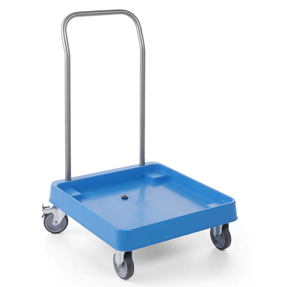 Numer producenta: 877197Wózek transportowy do przewozu koszy do zmywarekCechy produktu:– wykonany z poliwęglanu– 4 koła: 2 skrętne z hamulcami i 2 stałe– uchwyt ze stali nierdzewnej– odpowiedni na kosze do zmywarek o wymiarach 500x500mmParametry:– wymiary: 575x545x(H)920mmW zestawie:– Wózek na kosze do zmywarek