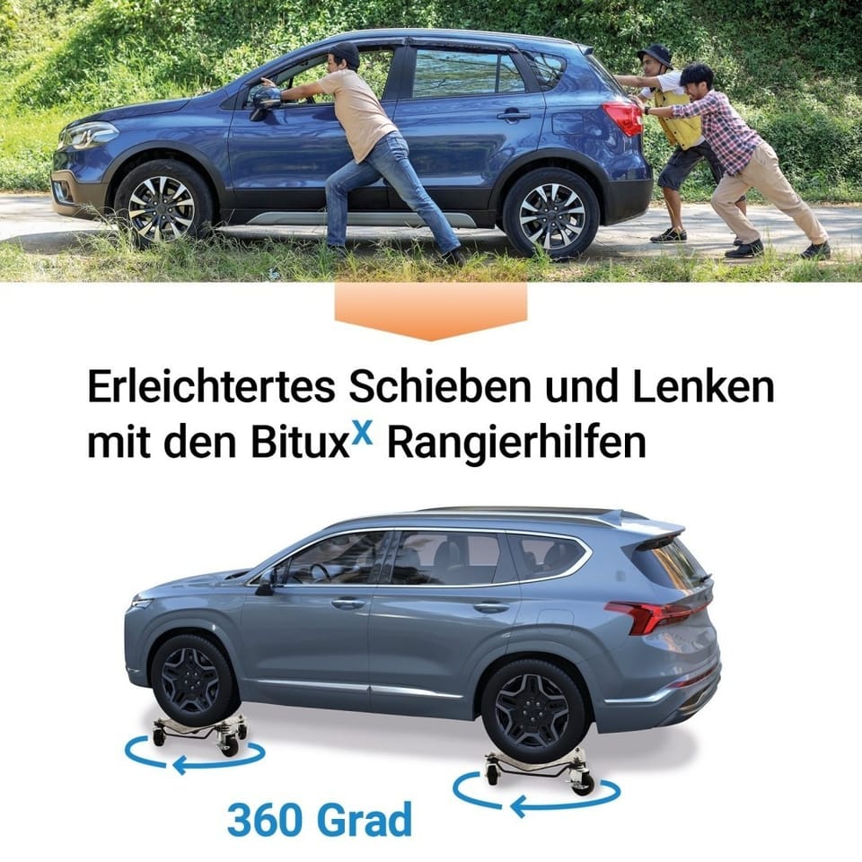 Manewrowanie samochodem jeszcze nigdy nie było tak proste. Zestaw 4 wózków manewrowych Bituxx umożliwia przesuwanie pojazdu bez uruchamiania silnika, nawet w bardzo ciasnych przestrzeniach. Auto można ustawić w dowolnej pozycji, również bokiem lub po przekątnej.
