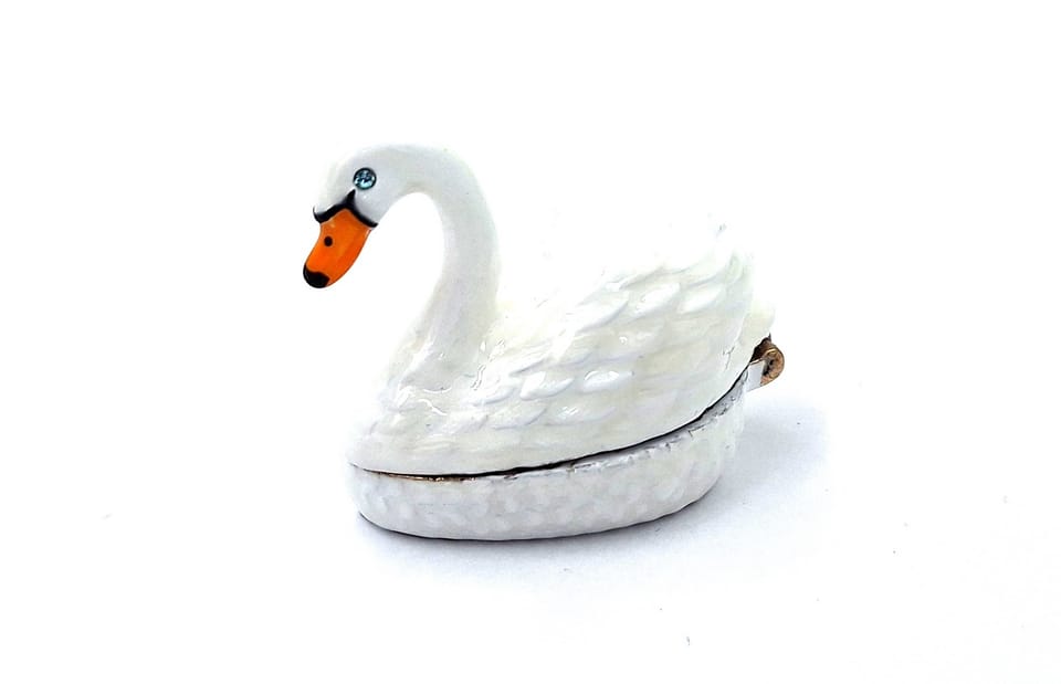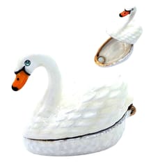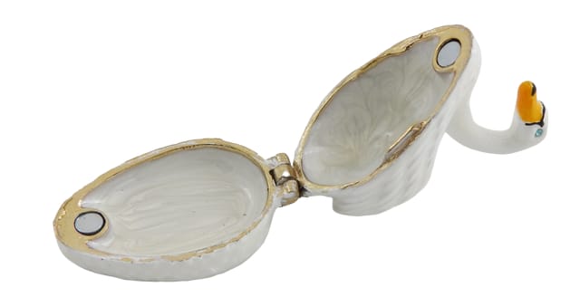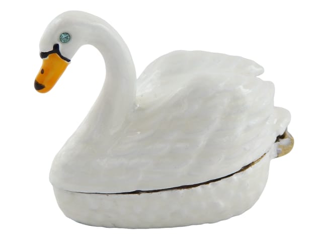 Wyjątkowe, metalowe pudełeczko prezentowe – Łabędź - B0736-02 To idealny pomysł na prezent dla miłośników oryginalnych przedmiotów. Pudełko w kształcie łabędzia z pewnością zrobi wrażenie na obdarowanej osobie, niezależnie od okazji. Może służyć do przechowywania biżuterii lub innych drobiazgów. Pomimo niewielkich rozmiarów (5x3.7x2.7 cm), pudełko może stanowić ciekawy element dekoracyjny. Oryginalny kształt łabędzia, wysokiej jakości materiały (metal - cynk, szkliwo i kryształ) oraz eleganckie zdobienia w kolorze białym i złotym sprawiają, że pudełko doskonale sprawdzi się jako dekoracja biurka, toaletki, komody lub regału. Eleganckie pudełko w kształcie łabędzia. Wymiary: 5x3.7x2.7 cm. Idealne do przechowywania biżuterii lub innych drobiazgów. Informacje o produkcie: • Wymiary: 5x3.7x2.7 cm • Materiał: metal (cynk), szkliwo, kryształ • Kolor: biały, złoty • Cechy charakterystyczne: o Oryginalny design o Wysoka jakość wykonania o Idealne do przechowywania biżuterii o Doskonały pomysł na prezent