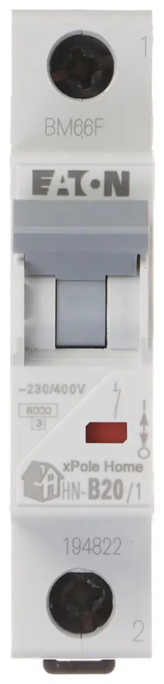 Wyłącznik nadprądowy o charakterystyce typu B i prądzie znamionowym 20AWyłącznik HN-B20/1 jest przewidziany do montażu na szynie DIN TS-35