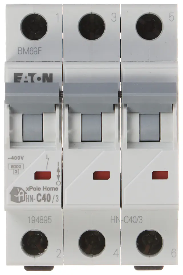 Wyłącznik nadprądowy o charakterystyce typu C i prądzie znamionowym 40AWyłącznik HN-C40/3 jest przewidziany do montażu na szynie DIN TS-35