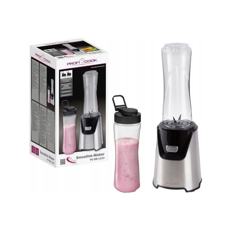 NAJWYŻSZEJ JAKOŚCIBLENDER KIELICHOWYMIKSER ROBOT SMOOTHIERENOMOWANEJ FIRMY PROFICOOKMODEL: PC-SM 1153Uniwersalny mikser do przygotowywania soków z owoców lub warzyw, ubijania, siekania i mieszania.Składający się z podstawy, pojemników do mieszania i pokrywki z otworem.""Mix & Go"" - Miksuj ulubiony shake w ciągu kilku minut. Dzięki praktycznemu otworowi do picia możesz zabrać ze sobą świeżo przygotowane koktajle do szkoły, pracy lub sportuIdealny do przygotowywania napojów fitness, napojów mlecznych, koktajli, zup, sosóc typu salsa, jedzenia dla niemowlątZawiera przykładowe przepisyPojemnik do mieszania z Tritanem (bez BPA), również jako kubek do piciaPokrywka z otworem do piciaSilnik o dużej mocy, 400W1 prędkość- impuls2 zdejmowane pojemniki miksera (600ml)Ostrza ze stali nierdzewnejPraca możliwa tylko, gdy pojemnik znajduje się na mikserzeDoskonała stabilność dzięki gumowym nóżkom220-240V, 50/60Hz, 400WPARAMETRY TECHNICZNE:Składa się z podstawy, 2x kubków mieszających i pokrywki z kapslempokrywa z otworem do piciaMocny silnik 400 W1 prędkość (impuls)2x odpinane dzbanki miksujące (600 ml)Ostrze ze stali nierdzewnej (nierdzewne)Obwód bezpieczeństwa - działanie możliwe tylko przy założonym zbiornikuDoskonała stabilność dzięki gumowym przyssawkomKolor: Srebrno-czarnyMoc: 400 WWaga: ok. 1,23 kgSzerokość: 130 mmWysokość: 375 mmGłębokość: 130 mmZasilanie: 220 - 240 V~, 50 / 60 Hzslimtex