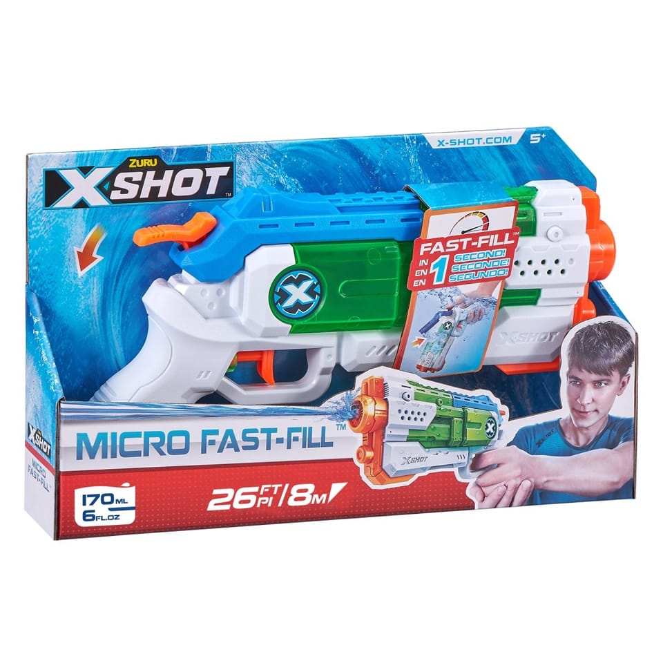 - Micro Blaster X-Shot Fast Fill wypełnia się wodą szybciej, niż jakiekolwiek inne wyrzutnie wodne. Wystarczy 1 sekunda, by był gotowy do działania!