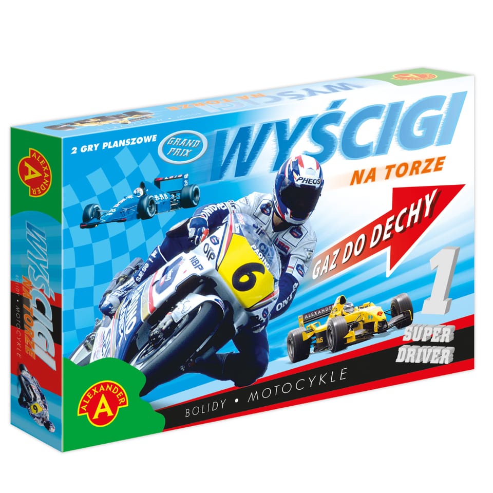 Wyścigi motocykli i bolidów to dwie emocjonujące gry planszowe. Wygrywa w nich ten, kto pierwszy postawi swój pionek na ostatnim polu trasy. Jednak aby to zrobić gracze muszą pokonać wiele przeszkód. Emocjonująca rozgrywka zapewnia doskonałą zabawę całej rodzinie. Gra świetnie uczy dzieci podstawowych zasad dominujących w planszówkach.plansza do gry, 4 pionki, kostka, instrukcja