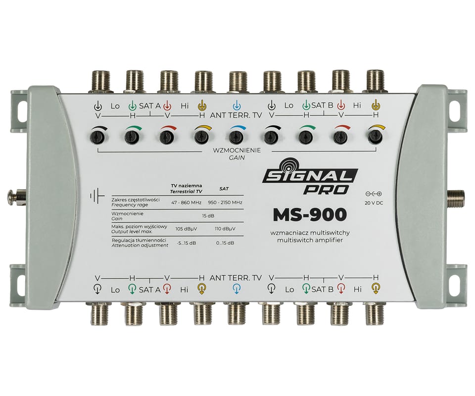 MS-900 to profesjonalny wzmacniacz magistrali multiswitchowej dla dwóch pozycji satelitarnych i toru RTV. Przeznaczony do współpracy z multiswitchami serii SIGNAL PRO. Urządzenie MS-900 zostało zaprojektowane z myślą o dużych i rozbudowanych instalacjach RTV-SAT, w których wymagane jest kaskadowe łączenie wielu multiswitchy serii SIGNAL PRO.
