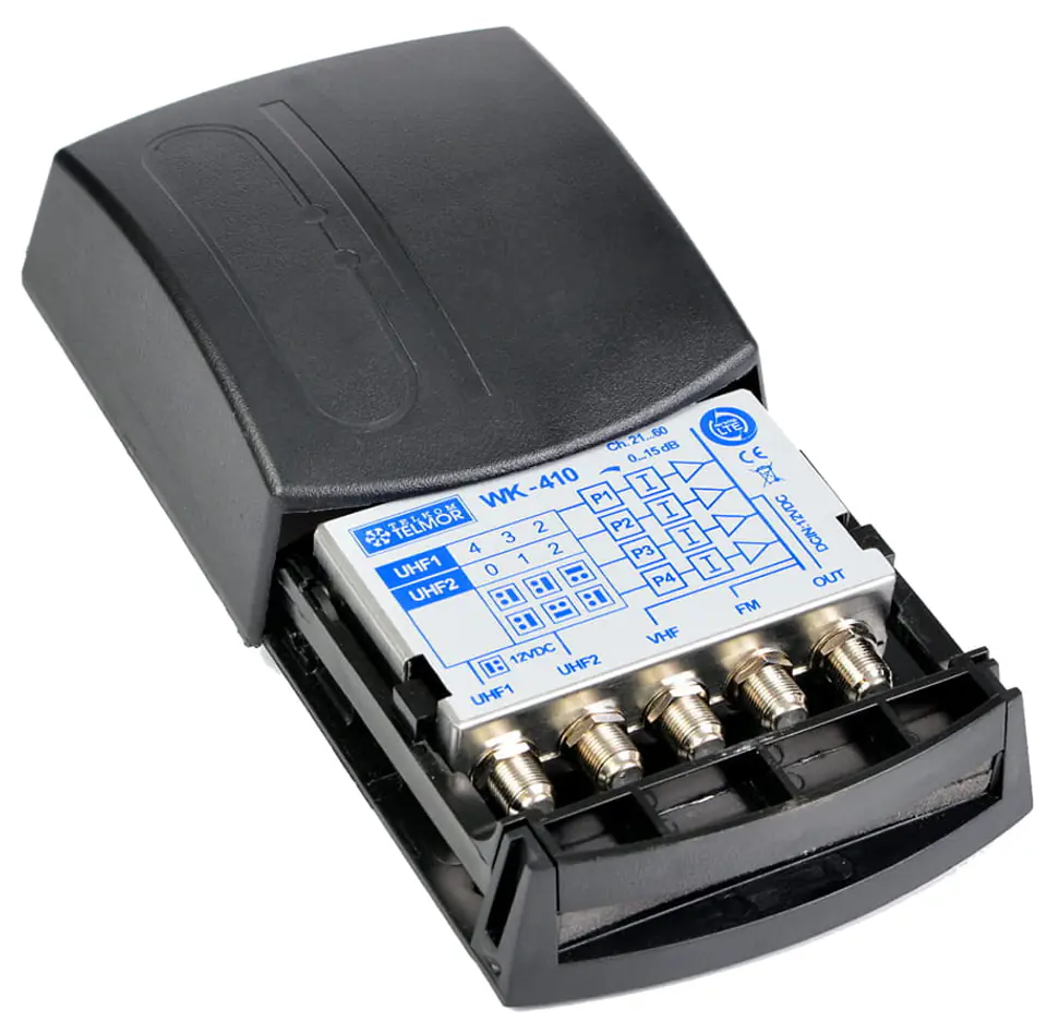 Przydziały filtrów do każdego z wejść UHF można ustalić za pomocą zworek (możliwe są opcje 0/4, 1/3,2/2). Dodatkowo wzmacniacz spina wszystkie wejścia na zasadzie zwrotnicy antenowej, zatem gotowy jest do sumowania sygnałów z różnych anten, łącznie z gotowością odbioru MUX-a w paśmie VHF. Uzupełniająco, na wejściu UHF1, WK-410 posiada wbudowany filtr, wykonany w technologii SAW, który eliminuje niekorzystny wpływ zakłóceń pochodzących od sygnałów mobilnego Internetu (LTE).