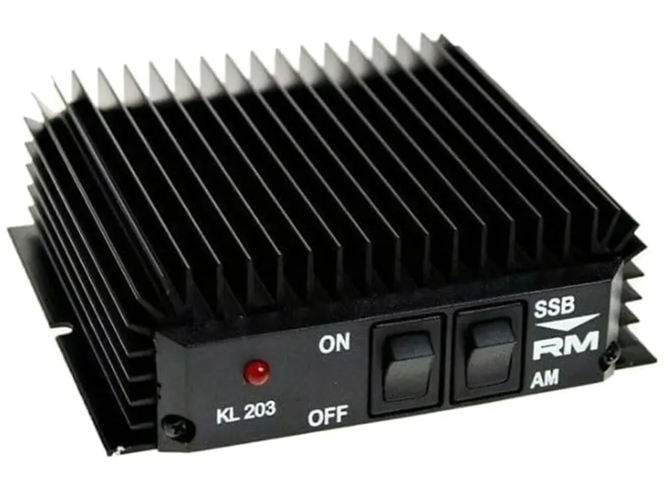KL 203, to najpopularniejszy wzmacniacz tranzystorowy znanej włoskiej firmy RM. Maksymalna moc wyjściowa 100W AM/FM, 200W SSB. Wzmacniacz należy stosować tylko z bardzo dobrze zestrojoną anteną. Przy wysokim SWR może się uszkodzić końcowy stopień mocy, który nie podlega gwarancji.