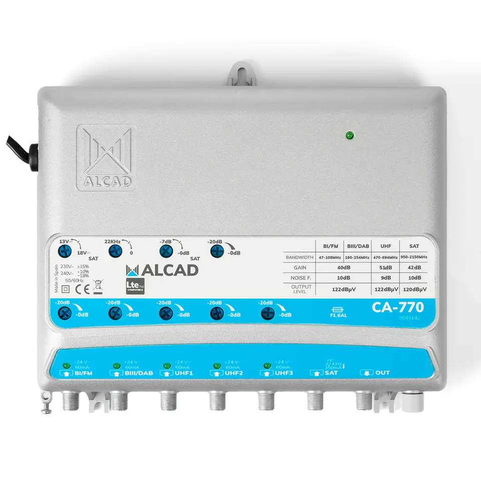 Zastosowanie wzmacniacz Alcad CA-770Przeznaczony do średnich i dużych instalacji analogowych i cyfrowych SMARTV, na które ma wpływ transmisja sygnałów komórkowych LTE700 i LTE800 (tzw. filtr LTE). Używany jako jedno urządzenie do przetwarzania wszystkich sygnałów telewizji naziemnej i satelitarnej, co znacznie upraszcza instalację. Posiada regulację wzmocnienia dla każdego wejścia naziemnego i SAT.