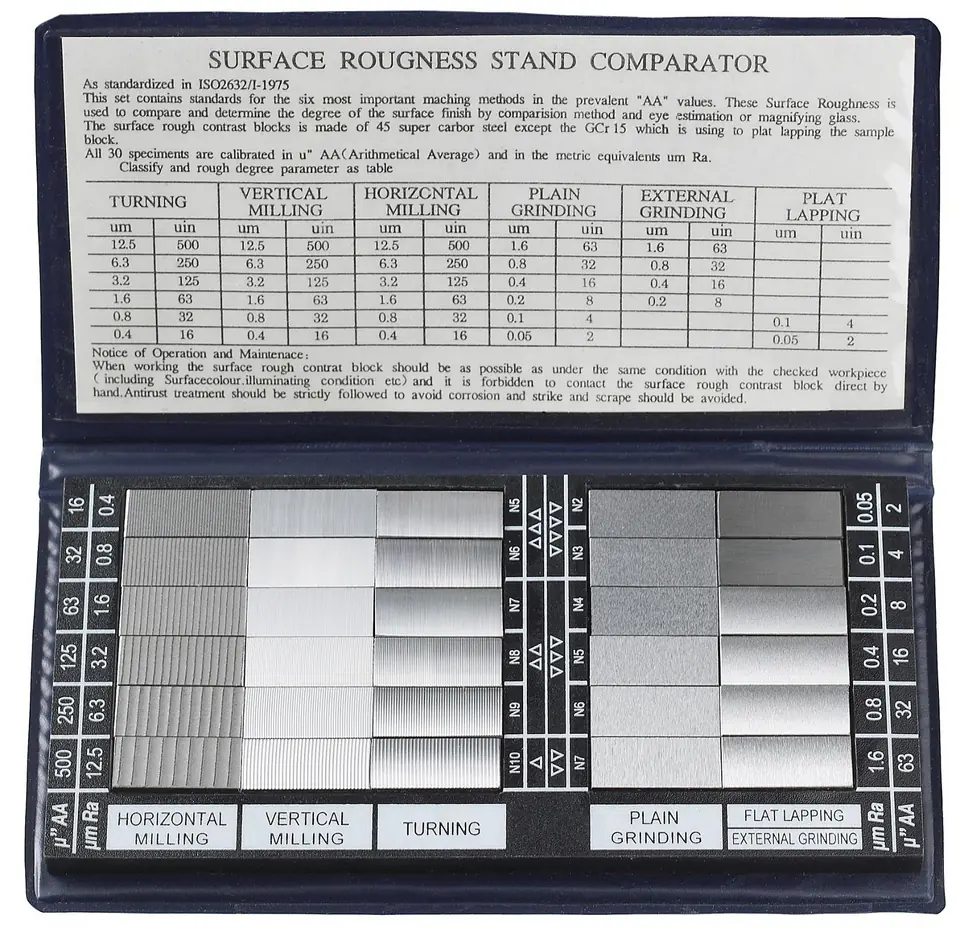 Do określania chropowatości metodą porównawczą wzrokową, lub poprzez drapanie paznokciem. Dla operatorów obrabiarek, kontrolerów jakości i konstruktorów. Uwzględniają 6 różnych metod obróbki i po 6 różnych wartości współczynnika Ra dla każdej z nich. Wykonane ze stali nierdzewnej stopowej. Odporne na zadrapania.
