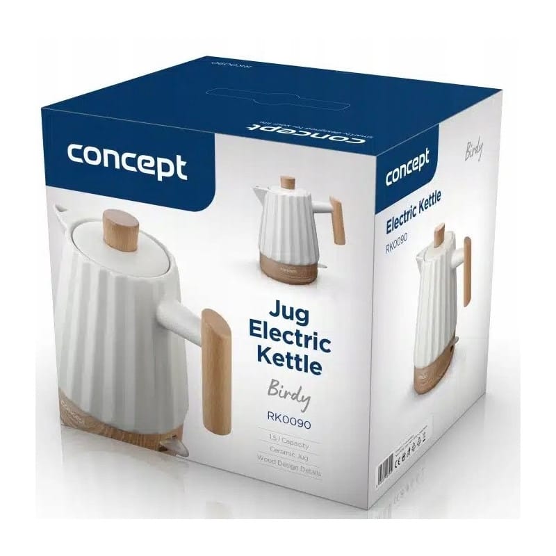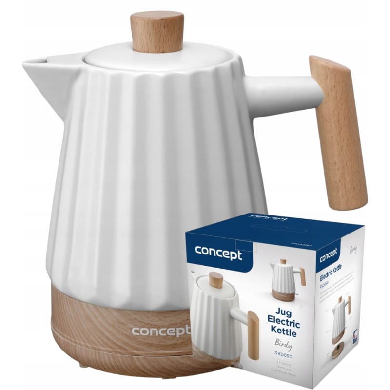 NAJWYŻSZAJ JAKOŚCICZAJNIK ELEKTRYCZNYRENOMOWANEJ FIRMY CONCEPTMODEL: RK-0090Ceramiczny czajnik elektryczny Birdy RK0090 o pojemności 1,5 l to elegancki i stylowy dodatek do każdej kuchni. Połączenie czystej białej ceramiki i wysmakowanego designu drewna tworzy nowoczesny, a jednocześnie naturalny wygląd, który łatwo wkomponuje się w różne wnętrza.Wniesie do kuchni odrobinę elegancji i naturalnego piękna, stając się nie tylko funkcjonalnym, ale także dekoracyjnym elementem Twojego domu. Elegancki design białej ceramiki i imitacji drewna Główne zalety czajnika ceramicznegoCeramiczny czajnik elektryczny nie tylko wprowadza do kuchni elegancki wygląd, ale również oferuje szereg praktycznych korzyści. Ceramika to materiał zdrowotnie nieszkodliwy, który nie uwalnia żadnych szkodliwych substancji do wody, zapewniając tym samym czystą i bezpieczną wodę do picia.Dzięki doskonałym właściwościom izolacyjnym woda w ceramicznym czajniku pozostaje ciepła przez dłuższy czas, co przyczynia się do oszczędności energii.Powierzchnia czajnika jest odporna na plamy i zapachy, dzięki czemu woda zachowuje swój czysty smak, a czajnik jest łatwy w utrzymaniu czystości. Dodatkowo ceramika jest materiałem ekologicznym, przyjaznym dla środowiska. Połączenie estetycznych i funkcjonalnych cech sprawia, że ceramiczny czajnik elektryczny to idealny wybór do każdej kuchni.StrixCzajnik wyposażony jest w złącze brytyjskiej marki STRIX, które gwarantuje najwyższą jakość, niezawodność oraz wydłuża żywotność urządzenia.Prosta obsługa i łatwa konserwacjaCzajnik wyposażony jest w w pełni zdejmowaną pokrywkę, co ułatwia jego czyszczenie i napełnianie. Wysokiej jakości uszczelka zapobiega wyciekom pary podczas podgrzewania wody, co zwiększa efektywność grzania i zapobiega przypadkowemu wylewaniu wody. Zintegrowany filtr przeciw osadom zatrzymuje zanieczyszczenia i kamień, utrzymując wodę czystą i poprawiając smak napojów. Ukryta grzałka zapobiega osadzaniu się kamienia i ułatwia konserwację czajnika.Główny przełącznik pełni również funkcję wskaźnika pracy, sygnalizując, że czajnik jest włączony. W pełni obracana podstawa zapewnia wygodne użytkowanie pod każdym kątem i zawiera praktyczną przestrzeń do przechowywania kabla zasilającego, utrzymując powierzchnię roboczą czystą i uporządkowaną.Potrójny system bezpieczeństwaCzajnik RK0090 wyposażony jest w potrójny system bezpieczeństwa, który zapewnia maksymalną ochronę podczas codziennego użytkowania. Pierwszy poziom obejmuje automatyczne wyłączenie po osiągnięciu punktu wrzenia, co zapobiega przegrzaniu. Drugi poziom systemu bezpieczeństwa aktywuje się, gdy czajnik nie wykryje odpowiedniej ilości wody.Trzeci poziom to zabezpieczenie, które automatycznie wyłącza czajnik po zdjęciu go z podstawy. Czajnik wyposażony jest także w antypoślizgowe nóżki, które stabilizują urządzenie na blacie roboczym, zapewniając bezpieczne użytkowanie.Parametry techniczne:Pojemność: 1,5 lZłącze najwyższej jakości (brytyjska marka STRIX)Ukryta grzałkaPokrywka z uszczelkąFiltr przeciw osadomWskaźnik pracyObrotowa podstawa 360°Podstawa z miejscem na przechowywanie kabla zasilającegoPotrójny system bezpieczeństwa: automatyczne wyłączenie przy braku wody, po osiągnięciu punktu wrzenia i po zdjęciu z podstawyAntypoślizgowa podstawaMateriał: ceramikaWymiary (wys. x szer. x gł.): 24 x 23 x 15 cmWaga: 1,65 kgNapięcie: 220 – 240 V, 50/60 HzMoc: 1500 Wslimtex