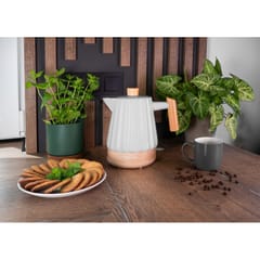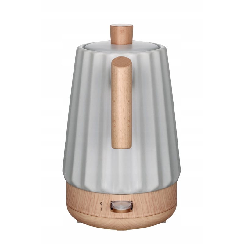 NAJWYŻSZAJ JAKOŚCICZAJNIK ELEKTRYCZNY CERAMICZNYRENOMOWANEJ FIRMY CONCEPTMODEL: RK-0091 JASNO SZARYCeramiczny czajnik elektryczny Birdy RK0091 o pojemności 1,5 l to elegancki i stylowy dodatek do każdej kuchni. Połączenie czystej białej ceramiki i wysmakowanego designu drewna tworzy nowoczesny, a jednocześnie naturalny wygląd, który łatwo wkomponuje się w różne wnętrza.Wniesie do kuchni odrobinę elegancji i naturalnego piękna, stając się nie tylko funkcjonalnym, ale także dekoracyjnym elementem Twojego domu. Elegancki design białej ceramiki i imitacji drewna Główne zalety czajnika ceramicznegoCeramiczny czajnik elektryczny nie tylko wprowadza do kuchni elegancki wygląd, ale również oferuje szereg praktycznych korzyści. Ceramika to materiał zdrowotnie nieszkodliwy, który nie uwalnia żadnych szkodliwych substancji do wody, zapewniając tym samym czystą i bezpieczną wodę do picia.Dzięki doskonałym właściwościom izolacyjnym woda w ceramicznym czajniku pozostaje ciepła przez dłuższy czas, co przyczynia się do oszczędności energii.Powierzchnia czajnika jest odporna na plamy i zapachy, dzięki czemu woda zachowuje swój czysty smak, a czajnik jest łatwy w utrzymaniu czystości. Dodatkowo ceramika jest materiałem ekologicznym, przyjaznym dla środowiska. Połączenie estetycznych i funkcjonalnych cech sprawia, że ceramiczny czajnik elektryczny to idealny wybór do każdej kuchni.StrixCzajnik wyposażony jest w złącze brytyjskiej marki STRIX, które gwarantuje najwyższą jakość, niezawodność oraz wydłuża żywotność urządzenia.Prosta obsługa i łatwa konserwacjaCzajnik wyposażony jest w w pełni zdejmowaną pokrywkę, co ułatwia jego czyszczenie i napełnianie. Wysokiej jakości uszczelka zapobiega wyciekom pary podczas podgrzewania wody, co zwiększa efektywność grzania i zapobiega przypadkowemu wylewaniu wody. Zintegrowany filtr przeciw osadom zatrzymuje zanieczyszczenia i kamień, utrzymując wodę czystą i poprawiając smak napojów. Ukryta grzałka zapobiega osadzaniu się kamienia i ułatwia konserwację czajnika.Główny przełącznik pełni również funkcję wskaźnika pracy, sygnalizując, że czajnik jest włączony. W pełni obracana podstawa zapewnia wygodne użytkowanie pod każdym kątem i zawiera praktyczną przestrzeń do przechowywania kabla zasilającego, utrzymując powierzchnię roboczą czystą i uporządkowaną.Potrójny system bezpieczeństwaCzajnik RK0091wyposażony jest w potrójny system bezpieczeństwa, który zapewnia maksymalną ochronę podczas codziennego użytkowania. Pierwszy poziom obejmuje automatyczne wyłączenie po osiągnięciu punktu wrzenia, co zapobiega przegrzaniu. Drugi poziom systemu bezpieczeństwa aktywuje się, gdy czajnik nie wykryje odpowiedniej ilości wody.Trzeci poziom to zabezpieczenie, które automatycznie wyłącza czajnik po zdjęciu go z podstawy. Czajnik wyposażony jest także w antypoślizgowe nóżki, które stabilizują urządzenie na blacie roboczym, zapewniając bezpieczne użytkowanie. Parametry techniczne:Pojemność: 1,5 lZłącze najwyższej jakości (brytyjska marka STRIX)Ukryta grzałkaPokrywka z uszczelkąFiltr przeciw osadomWskaźnik pracyObrotowa podstawa 360°Podstawa z miejscem na przechowywanie kabla zasilającegoPotrójny system bezpieczeństwa: automatyczne wyłączenie przy braku wody, po osiągnięciu punktu wrzenia i po zdjęciu z podstawyAntypoślizgowa podstawaMateriał: ceramikaWymiary (wys. x szer. x gł.): 24 x 23 x 15 cmWaga: 1,65 kgNapięcie: 220 – 240 V, 50/60 HzMoc: 1500 Wslimtex