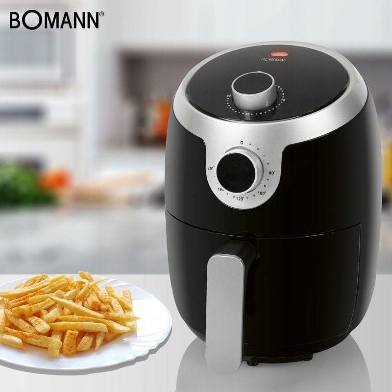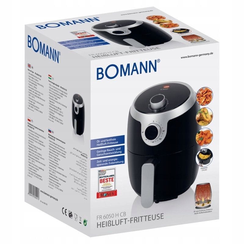 NAJWYŻSZEJ JAKOŚCIFRYTKOWNICA BEZTŁUSZCZOWANA GORĄCE POWIETRZERENOMOWANEJ FIRMY BOMANNMODEL: FR 6050 H CBKompaktowa, beztłuszczowa frytkownica powietrzna o mocy 1000W i pojemności koszyka 1.8 L.Frytkownica działa bez użycia tłuszczu, potrawy przygotowywane są przy pomocy cyrkulacji gorącego powietrza. Szeroki zakres temperatur od 80 do 200°C, umożliwia sprawne przygotowanie potraw.Bomann FR 6050 H CB to kompaktowa, beztłuszczowa frytkownica powietrzna - połączenie pieca konwekcyjnego, grilla i frytkownicy. Umożliwia smażenie potraw bez użycia tłuszczu – przygotowywanie potraw odbywa się przy pomocy cyrkulacji gorącego powietrza. Dzięki temu potrawy są zdrowsze, mają mniej kalorii a poziom tłuszczu spada nawet o 95%. Urządzenie ma szerokie zastosowanie - dzięki niemu możemy piec, grillować, smażyć, podgrzewać, rozmrażać oraz opiekać. Przygotujemy w nim między innymi frytki, mięso, ryby, warzywa a nawet ciastka.Technologia termoobiegu powoduje że przygotowywane potrawy są chrupiące na zewnątrz i odpowiednio miękkie w środku. Kolejną zaletą jest zdecydowanie większa sprawność w porównaniu do frytkownicy konwencjonalnej – potrawy przygotowywane są szybciej z uwagi na ekspresowe nagrzewanie się frytkownicy.Metoda ta gwarantuje wydzielanie zdecydowanie mniejszej ilości pary i nieprzyjemnych zapachów w porównaniu do tradycyjnych frytkownic. Oszczędzamy również duże ilości oleju które zużywa się w konwencjonalnej frytkownicy.Dlaczego warto kupić frytkownicę beztłuszczową Bomann FRUrządzenie 3w1Urządzenie łączy w sobie funkcjonalność pieca konwekcyjnego, grilla i frytkownicyBez dodatku tłuszczuPrzygotowywanie potraw odbywa się przy pomocy cyrkulacji gorącego powietrza. Dzięki temu potrawy są zdrowsze, mają mniej kalorii a poziom tłuszczu spada nawet o 95%WydajnośćKosz o pojemności aż 1,8l litra pozwolą na szybkie przygotowanie większego posiłkuWszechstronnośćUrządzenie ma szerokie zastosowanie - dzięki niemu możemy piec, grillować, smażyć, podgrzewać, rozmrażać oraz opiekać. Przygotujemy w nim między innymi frytki, mięso, ryby, warzywa a nawet ciastka.Idealna na prezentUrządzenie posiada eleganckie opakowanie, dzięki czemu idealnie sprawdzi się, jako prezent!Timer pozwala dobrać odpowiedni czas przygotowywania potraw. Aby rozpocząć, wystarczy ustawić czas na pokrętle minutowym oraz żądaną temperaturę - po upływie zaprogramowanego czasu urządzenie automatycznie wyłączy się i poinformuje sygnałem dźwiękowym o zakończonym procesie. Urządzenie zaprojektowane jest pod kątem wygodnego czyszczenia oraz bezpiecznego przygotowania – posiada demontowalny pojemnik przystosowany do mycia w zmywarce, nienagrzewający się uchwyt oraz zabezpieczenie przeciw przegrzaniu i wyjęciu pojemnika.Najważniejsze cechy frytkownicy Bomann FR 6057 H CB:Beztłuszczowa frytownica na gorące powietrzeNiska emisja oparów i zapachówOszczędność czasu i energiiChłodny w dotyku uchwytPojemność 1.8 litraPojemnik z powłoką non-stick ( nie przywiera)Bezstopniowo regulowany termostat (80 ° C-200 ° C)Zegar 30-minutowy z sygnałem wyłączającymLampka kontrolnaZabezpieczenie przed przegrzaniemOznaczenia CE - spełnia wszystkie restrykcyjne normy UEZasilanie: 220-240 V~, 50-60 Hz, 1000 WUrządzenie pozwala na przygotowanie:FrytekKrewetek w tempurzeKotletów i burgerówRacuchówRybFaworkówMuffinekWarzyw i wiele innych ...Produkty ziemniaczane, czas pieczenia, temperatura:Cienkie frytki mrożone: 18 – 20 min, 200 (°C)Grube frytki mrożone: 18 – 25 min, 200 (°C)Zapiekanka ziemniaczana: 20 – 25 min, 200 (°C)Mięso, czas pieczenia, temperatura:Stek: 10 - 15 min, 180 (°C)Kotlet wieprzowy: 10 – 15 min, 180 (°C)Hamburger: 10 – 15 min, 180 (°C)Kiełbaski w cieście: 13 – 15 min, 200 (°C)Udka kurczaka: 25 – 30 min, 180 (°C)Pierś kurczaka: 15 – 20 min, 180 (°C)Ciasta, czas pieczenia, temperatura:Ciasto maks 10 cm : 20 – 25 min, 160 (°C)Mufinki: 15 – 18 min, 200 (°C)Biszkopt maks 10 cm: 20 -22 min, 180 (°C)Lekkie przekąski, czas pieczenia, temperatura:Mrożone skrzydełka kurczaka: 6-10 min, 200 (°C)Mrożone paluszki rybne: 6- 10 min, 200 (°C)Sajgonki: 8 – 10 min, 200 (°C)Warzywa nadziewane 10 min, 160 (°C)Mrożone panierowane przekąski serowe: 8 – 10 min, 180 (°C)Wymiary frytkownicy:Wymiary: (ok. szer. x wys. x gł.) i wagaUrządzenie: 220 x 390 x 270 mm; 2.4 kgOpakowanie: 245 x 312 x 245 mm; 2.7 kg Produkt został odznaczony certyfikatem FOCUS - TEST DEUTSCHLANDS BESTECertyfikat TEST DEUTSCHLANDS BESTE został przyznany na podstawie badań przeprowadzonych przez „Germanys best household electronics”. W ramach testu porównane zostały produkty wybrane z ponad 20 000 marek z 274 segmentów rynkowych.Celem wyróżnienia „Focus” jest wskazywanie produktów cieszących się największym uznaniem konsumentów. Certyfikat przyznany jest na podstawie badań niemieckiego rynku i potwierdza wysoką jakość produktów a także świadczy o dużym zaufaniu konsumentów i renomie marki.SLIMTEX