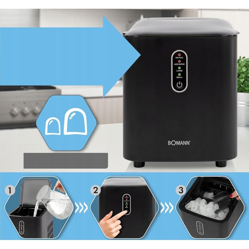 NAJWYŻSZEJ JAKOŚCIKOSTKARKA DO KOSTEK LODU FIRMY BOMANNMODEL: EWB 6068Nasza kostkarka do lodu to idealne rozwiązanie, które sprawi, że każda okazja stanie się wyjątkowa! Dzięki łatwej obsłudze, szybkiemu przygotowaniu lodu i solidnej konstrukcji, jest to niezastąpione urządzenie w każdym domu, barze czy restauracji.Kostki lodu w mgnieniu oka będą gotowe, by schłodzić napój w gorące dni, czy przygotować pyszne drinki.Kompaktowa kostkarka do lodu. Idealna do biura, zastosowań domowych i gastronomicznych. Wystarczy tylko wlać wodę i nacisnąć jeden przycisk aby otrzymać zmrożone kostki lodu. Kostkarka daje możliwość wykonania dwóch rozmiarów kostek lodu - małych i dużychPojemność zbiornika wody to 1.1 litra - urządzenie potrafi wytworzyć ok. 8-12 kg lodu w ciągu doby. Obsługa urządzenia jest niezwykle prosta - sprowadza się do wlania wody, wciśnięcia przycisku i odczekania około 10 minut - tylko tyle wystarczy, aby móc otrzymać gotowe kostki lodu i dodać je do ulubionego napoju. Do wyboru mamy dwie wielkości kostek lodu.O wszelkich czynnościach wymagających ingerencji poinformuje kontrolka LED. Kostkarka zajmuje niewiele miejsca, dzięki czemu śmiało można z niej korzystać w domu, biurze, czy małej gastronomii lub kamperze.Najważniejsze cechy kostkarki do lodu Bomann EWB 6068:Kompaktowa kostkarka do loduIdealna do biura, zastosowań domowych oraz gastronomicznychDwa rozmiary kostek do wyboruKostki lodu gotowe w 10 minutDo wytworzenia lodu wystarczy wlanie wody i naciśnięcie jednego przyciskuNie wymaga skomplikowanej instalacji i obsługiZbiornik na wodę o pojemności 1.1 litra8-12 kg kostek w 24hWskaźniki LED informujące o działaniu urządzenia, konieczności dolania wody oraz zapełnionym pojemniku na kostkiOszczędność energii dzięki automatycznemu wyłącznikowi po zakończeniu pracyMożliwość kontroli pracy dzięki transparentnej pokrywieCicha pracaŁopatka do kostek w zestawieOznaczenia CE - spełnia wszystkie restrykcyjne normy UEZasilanie sieciowe: 220-240 V~, 50 Hz, 120 WKompaktowa kostkarka do lodu. Idealna do biura, zastosowań domowych i gastronomicznych. Wystarczy tylko wlać wodę i nacisnąć jeden przycisk aby otrzymać zmrożone kostki lodu. Kostkarka daje możliwość wykonania dwóch rozmiarów kostek lodu - małych i dużychDlaczego warto kupić maszynę do lodów Bomann EWB Kostki takie jak lubiszPanel starowania umożliwia wybór spośród dwóch rozmiarów kostek loduProsta w obsłudzeObsługa urządzenia sprowadza się do wlania wody, wciśnięcia przycisku i odczekania dziesięciu minut na gotowe kostkiWydajnaW ciągu 24h przygotuje nawet 12kg kostek lodu do napojów i drinków, dlatego jest idealna na imprezy lub podczas upałówIdealna na prezentUrządzenie posiada eleganckie opakowanie, dzięki czemu idealnie sprawdzi się, jako prezent!Zainwestuj w komfort i funkcjonalność – nie musisz już martwić się o brak lodu podczas spotkań czy imprez.Ciesz się zimnymi napojami zawsze, gdy tego potrzebujeszWymiary kostkarki:Wymiary (ok. szer. x wys. x gł.) i wagaUrządzenie: 205 x 265 x 282 mm; 7.0 kgOpakowanie: 239 x 295 x 324 mm; 8.0 kg Produkt został odznaczony certyfikatem FOCUS - TEST DEUTSCHLANDS BESTECertyfikat TEST DEUTSCHLANDS BESTE został przyznany na podstawie badań przeprowadzonych przez „Germanys best household electronics”. W ramach testu porównane zostały produkty z ponad 20 000 marek z 274 segmentów rynkowych.Celem wyróżnienia „Focus” jest wskazywanie produktów cieszących się największym uznaniem konsumentów. Certyfikat przyznany jest na podstawie badań niemieckiego rynku i potwierdza wysoką jakość produktów a także świadczy o dużym zaufaniu konsumentów i renomie marki.slimtex
