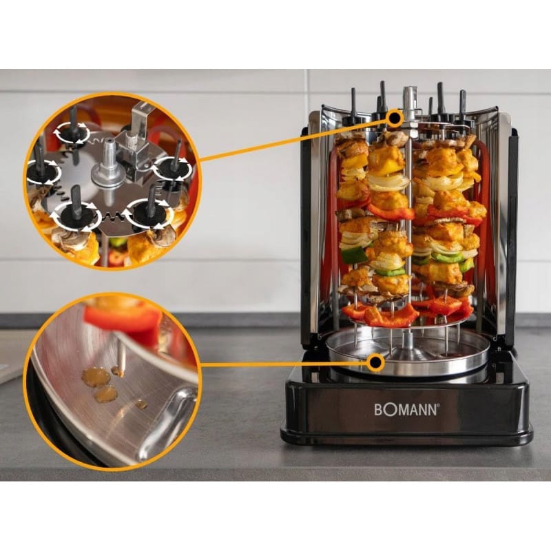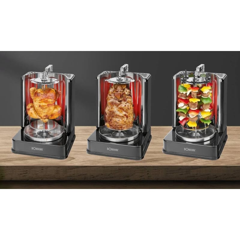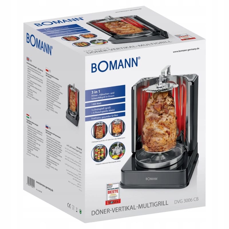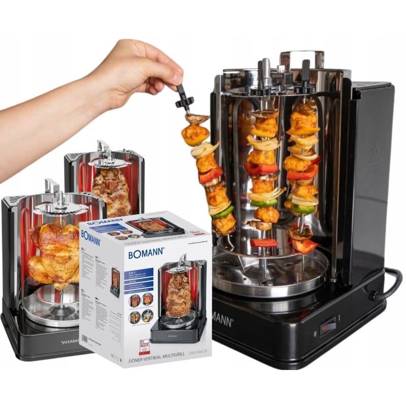 GRILL ELEKTRYCZNY OPIEKACZ DO KEBABA ROLLER KURCZAKA SZASZŁYKI DONER ROŻENURZĄDZENIE 3w1DO KEBABA / KURCZAKA / SZASZŁYKÓWNAJWYŻSZEJ JAKOŚCIRENOMOWANEJ FIRMY BOMANNMODEL: DVG 3006Zachwyć się smakiem różnorodnych kebabów – od kurczaka po soczyste mięsa – dzięki opiekaczowi do kebaba!Marzysz o pysznych, soczystych kawałkach mięsa otoczonych chrupiącą skórką, które smakują jak w najlepszej budce z kebabem Teraz możesz cieszyć się tym smakiem bez wychodzenia z domu! Opiekacz do kebaba, kurczaka, szaszłyków to idealne urządzenie, które pozwoli Ci przyrządzić w prosty sposób i w wygodnych warunkach.Zajmuje niewiele miejsca i jest wszechstronny - stojący multiopiekacz. Dzięki niemu przygotujesz soczyste przypieczone dania z warzyw, mięs a nawet owoców. Pełne smaku i zdrowia.Dzięki pionowemu mocowaniu kurczaka, gyrosa czy szaszłyków, równomiernie się zarumienią i przypieką. W środku zostając wilgotne i miękkie.Któż z nas nie lubi grillowanych potraw Pysznych przypieczonych warzyw i mięs, z chrupiącą skórką, pachnących i ciepłych. Kto z nas z przyjemnością nie przekąsi w ciągu dnia pożywnej, ciepłej kanapki z gyrosem i warzywami lub szaszłyka z ulubionymi składnikami Wszystkie te pyszności w mig przygotujesz z pionowym multigrillem. I nie musisz się już bać spożywania nadmiaru tłuszczu, ponieważ w trakcie opiekania, tłuszcz częściowo wypłynie z potrawy, abyś mógł jeść zdrowo i smacznie.Skorzystaj z dołączonych dodatków i ciesz się:grillowanym kurczakiem lub kiełbaskamikebabem, który dodasz do kanapki, zawiniesz w tortillę lub zjesz w zestawie obiadowymszaszłykami z kiełbasą, serem, warzywami i owocami - w dowolnej kombinacjiDoner multigrill jest prosty w obsłudze. Równomiernie opiecze zamocowane na obrotowym, pionowym ruszcie produkty. Czy to będzie mięso, czy warzywa. Silnik o mocy 1400 W będzie obracał ruszt wokół osi, a w przypadku chęci przygotowania szaszłyków - 6 szpilek do szaszłyków. To właśnie dzięki temu, powolnemu ruchowi mamy pewność, że umieszczone produkty będą tak samo upieczone z każdej strony.W komplecie znajduje się: rożen obrotowy do drobiu, kebaba i innych produktów, 6 szpikulców do szaszłyków, taca na tłuszcz i okruchy oraz uchwyt ze stali nierdzewnej do zdejmowania gorących akcesoriów.Najważniejsze cechy elektrycznego multigrilla Kebab:¦ Dzięki pionowej pozycji rusztu, wyciekający tłuszcz i sos kapie bezpośrednio do tacy na tłuszcz¦ Taca na tłuszcz i okruchy została wykonana ze stali nierdzewnej¦ W zestawie. 1 rożen obrotowy (duży) na kurczaki lub kebab / gyros¦ W zestawie. 6 oddzielnie obracanych małych szpikulców do szaszłyków¦ W zestawie. szczypce ze stali nierdzewnej¦ Wskaźnik świetlny¦ 220–240 V, 50/60 Hz, 1400 WIdealny na prezentUrządzenie posiada eleganckie opakowanie, dzięki czemu idealnie sprawdzi się, jako prezent!Idealny do szybkiego przygotowania obiadu, rodzinnych spotkań, a także przyjęć z przyjaciółmi – opiekacz do kebaba to wygodne rozwiązanie, które pozwala w łatwy sposób dostosować przygotowanie do swoich gustów. Zaskocz swoich bliskich i twórz pyszne, domowe kebaby, które będą smakować jak te w najlepszej restauracji!Pionowy opiekacz – dla miłośników mięsa, którzy cenią prostotę, smak i wygodę! Wymiary urządzenia:Wymiary: (ok. szer. x wys. x gł.)Urządzenie: 255 x 350 x 255 mm; 2.4 kgOpakowanie: 283 x 363 x 283 mm; 2.9 kg Produkt został odznaczony certyfikatem FOCUS - TEST DEUTSCHLANDS BESTECertyfikat TEST DEUTSCHLANDS BESTE został przyznany na podstawie badań przeprowadzonych przez „Germanys best household electronics”. W ramach testu porównane zostały produkty z ponad 20 000 marek z 274 segmentów rynkowych.Celem wyróżnienia „Focus” jest wskazywanie produktów cieszących się największym uznaniem konsumentów. Certyfikat przyznany jest na podstawie badań niemieckiego rynku i potwierdza wysoką jakość produktów a także świadczy o dużym zaufaniu konsumentów i renomie marki.slimtex