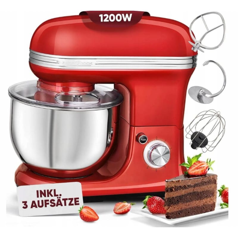 Robot kuchenny Profi Cook PC-KM 1197 1200 W Robot planetarny to idealne urządzenie do ugniatania i mieszania. Mocny i stabilny silnik zamknięty w pięknej, aluminiowej obudowie retro to nie tylko przydatne urządzenie, ale także stylowy dodatek. 8 trybów mieszania, program wolnych obrotów, trzy różne mieszadła - wszystko to zapewnia wysoki komfort pracy. 5 litrowa miska ugniata nawet do 3 kg cięższego ciasta np. drożdżowego lub chlebowego.Mocna maszyna do zgniatania ciasta z profesjonalnym, trwałym silnikiem o dużej mocy 1200 WMasywna aluminiowa obudowa odlewana ciśnieniowo (lakierowana) zapewniająca dużą stabilność urządzeniaSolidny specjalny mechanizm zapewniający trwałość i wysoką wydajność urządzeniaStała moc dzięki elektronicznej regulacji obrotów zależnej od obciążenia8 ustawień prędkości (0/1/2/3/4/5/6 + pulsowanie)Płynny rozruch umożliwiający powolne mieszaniePodświetlane pokrętło regulacyjneMiska ze stali nierdzewnej o pojemności 5,0 litrów, do przygotowania maksymalnie 2,5 – 3 kg ciastaUchylne, wielofunkcyjne ramię z mechanizmem odblokowaniaPrzeźroczysta pokrywa z otworem do napełniania (zdejmowana)Wyłącznik bezpieczeństwa – działa w przypadku ramienia wychylnegoOdlewane ciśnieniowo aluminiowe haki do ugniatania – do ciężkich mas na przykład ciasta drożdżowego lub na chlebOdlewane ciśnieniowo aluminiowe haki do mieszania np. ciastka, kruszonki i biszkoptyTrzepaczka ze stali nierdzewnej do ubijania jajek, śmietany i innych produktówZapewniona łatwość obsługi i czyszczeniaStabilna i bezpieczna pozycja dzięki nóżkom na przyssawkachUchwyt do szybkiego mocowania narzędziSolidne ramię przestawne(35°)Zalety robota ProfiCookStała moc dzięki regulacji obrotów umożliwia dokładne przyrządzenie masy, ciastaTryb pulsacyjny pozwoli na całkowitą kontrolę nad urządzeniem, sprawdzi się idealnie gdy chcemy coś lekko rozdrobnić lub delikatnie wymieszać8 stopniowa regulacja prędkości pozwala na dokładny dobór obrotów do przyrządzanego pożywieniaNóżki z przyssawkami zapewnią stabilność urządzeniaSolidna konstrukcja przekładni napędu gwarantuje trwałość urządzeniaDuża ilość akcesoriów umożliwi zastąpienie wielu urządzeń jednym
