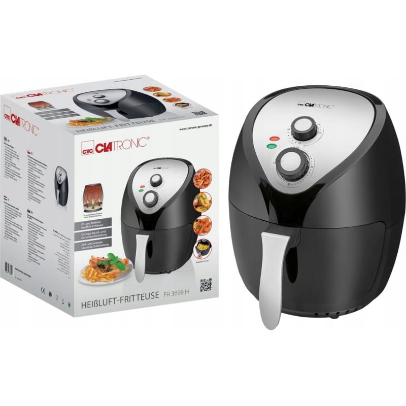 NAJWYŻSZEJ JAKOŚCIBEZTŁUSZCZOWA FRYTKOWNICARENOMOWANEJ FIRMY CLATRONICMODEL : FR 3699Kompaktowa, beztłuszczowa frytkownica powietrzna o mocy 1400W i pojemności koszyka 3.6 L. Frytkownica działa bez użycia tłuszczu, potrawy przygotowywane są przy pomocy cyrkulacji gorącego powietrza.Moc 1400W z szerokim zakresem temperatur od 80 do 200°C, umożliwia sprawne przygotowanie potraw.Kompaktowa, beztłuszczowa frytkownica powietrzna Clatronic FR 3699 H to połączenie pieca konwekcyjnego, grilla i frytkownicy. Umożliwia smażenie potraw bez użycia tłuszczu – przygotowywanie potraw odbywa się przy pomocy cyrkulacji gorącego powietrza. Dzięki temu potrawy są zdrowsze, mają mniej kalorii a poziom tłuszczu spada nawet o 95%. Urządzenie ma szerokie zastosowanie - dzięki niemu możemy piec, grillować, smażyć, podgrzewać, rozmrażać oraz opiekać. Przygotujemy w nim między innymi frytki, mięso, ryby, warzywa a nawet ciastka.Technologia termoobiegu powoduje że przygotowywane potrawy są chrupiące na zewnątrz i odpowiednio miękkie w środku.Kolejną zaletą jest zdecydowanie większa sprawność w porównaniu do frytkownicy konwencjonalnej – potrawy przygotowywane są szybciej z uwagi na ekspresowe nagrzewanie się frytkownicy. Metoda ta gwarantuje wydzielanie zdecydowanie mniejszej ilości pary i nieprzyjemnych zapachów w porównaniu do tradycyjnych frytkownic.Oszczędzamy również duże ilości oleju które zużywa się w konwencjonalnej frytkownicy.Timer pozwala dobrać odpowiedni czas przygotowywania potraw.Aby rozpocząć, wystarczy ustawić czas na pokrętle minutowym oraz żądaną temperaturę - po upływie zaprogramowanego czasu urządzenie automatycznie wyłączy się i poinformuje sygnałem dźwiękowym o zakończonym procesie.Urządzenie zaprojektowane jest pod kątem wygodnego czyszczenia oraz bezpiecznego przygotowania – posiada demontowalny pojemnik przystosowany do mycia w zmywarce, nienagrzewający się uchwyt oraz zabezpieczenie przeciw przegrzaniu i wyjęciu pojemnika.Najważniejsze cechy frytkownicy beztłuszczowej Clatronic FR 3699 H:Beztłuszczowa frytownica na gorące powietrzeNiska emisja oparów i zapachówOszczędność czasu i energiiChłodny w dotyku uchwytPojemność 3.6 litraPojemnik z powłoką non-stick (nie przywierająca)Bezstopniowo regulowany termostat (80 ° C-200 ° C)Zegar 30-minutowy z sygnałem wyłączającymDwie lampki kontrolneZabezpieczenie przed przegrzaniemMoc 1400 WUrządzenie pozwala na przygotowanie:FrytekKrewetek w tempurzeKotletów i burgerówRacuchówRybFaworkówMuffinekWarzywslimtex