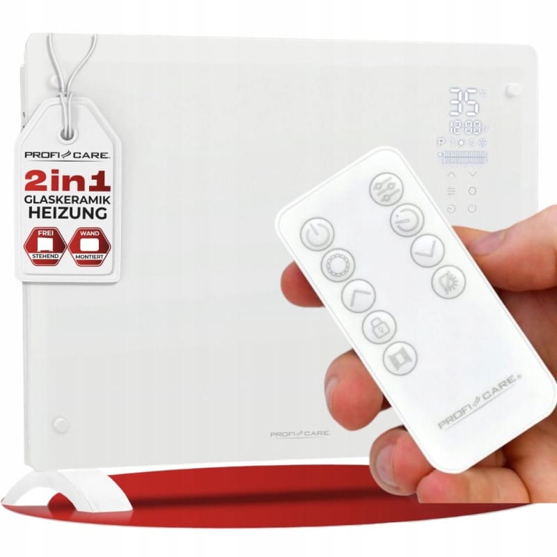 NAJWYŻSZEJ JAKOŚCIGRZEJNIK SZKLANYKONWEKTOROWYRENOMOWANEJ FIRMY PROFICAREMODEL: PC-GKH 3119 BIAŁYOgrzewanie elektryczne pro ogrzewania mieszkań, garaży, szklarni, warsztatów i tym podobnych. Idealnie nadaje się do ogrzewania w mroźną zimę. Urządzenie posiada automatyczne rozpoznawanie otwarcia okna - automatyczne wyłączanie po otwarciu okna.Ciche ogrzewanie bez hałasu roboczego (0dB).2w1: GRZEJNIK WISZĄCY LUB STOJĄCYUważasz proste grzejniki za nieestetyczne zło konieczne Z ProfiCare GKH 3118 nie musi tak być. Nie musisz już wybierać między stylowym, nowoczesnym wnętrzem a komfortem. Ten cichy, prosty grzejnik jest stylowo czysty i elegancki, dzięki czemu nie będzie zawstydzał środka salonu. Dodatkowo, wysokiej jakości powierzchnia z hartowanego szkła zapewnia idealną dystrybucję ciepła. Wypełnia pomieszczenie komfortowym ciepłem, jednocześnie oszczędzając pieniądze i energię, ponieważ nie jest wymagający do uruchomienia.Cicho i bez wysiłkuW porównaniu do innych metod ogrzewania, ProfiCare GKH 3118 zużywa o połowę mniej energii. W przeciwieństwie do termometrów lub innych grzejników opalanych bezpośrednio, ogrzewa pomieszczenie bez nieprzyjemnych zapachów i przepływu powietrza. Ponadto nie wysusza powietrza ani nie spala tlenu. Działa również bezgłośnie. Dzięki temu jest hipoalergiczny i utrzymuje zdrowe powietrze w domu.Bezpieczeństwo przede wszystkimMaksymalną temperaturę baterii można łatwo ustawić w skali od 5 do 50 stopni. A jeśli w pobliżu będą przebywać dzieci lub zwierzęta, włącz blokadę przed dziećmi. Szczególnie w garażu, warsztacie lub szklarni docenisz ochronę przed zamarzaniem.Dostępne ogrzewanieCiesz się wygodą zdalnego sterowania i włączaj ogrzewanie bezpośrednio z kanapy lub łóżka. Dzięki timerowi i siedmiu wstępnie ustawionym programom nie będziesz musiał myśleć o włączeniu ogrzewania. Wielofunkcyjny wyświetlacz XXL pozwala również zdalnie sprawdzić, jak długo trwa ogrzewanie.Ciepła pobudkaNie przepadasz za nocnym ogrzewaniem, ale chciałbyś nie musieć rano wychodzić spod rozgrzanej kołdry W takim razie użyj timera. Po prostu ustaw go na trzydzieści minut przed alarmem, a obudzisz się w komfortowym cieple. Konwektor automatycznie utrzyma ciepło, a Ty będziesz mógł leniuchować lub relaksować się w komforcie i bez zmartwień.Przód urządzenia jest wykonany z bezpiecznego szkła. Dzięki elementowi grzejnemu w kształcie X-Shape bardzo szybko się nagrzewa.PARAMETRY TECHNICZNE:Wielofunkcyjny wyświetlacz XXL2 poziomy ogrzewania (1000/2000 W)Cyfrowa regulacja temperatury od 5 do 50°CUrządzenie posiada ochronę przed zamarzaniem24 godzinny timer,7 programów czasowychAutomatyczna regulacja temperatury.Zamek dziecięcy.Ochrona przed przegrzaniemW zestawie materiał montażowyZasilanie 230 V, 50 HzTo urządzenie nadaje się tylko pro dobrze izolowanych pomieszczeń lub pro okazjonalnego użytkuslimtex