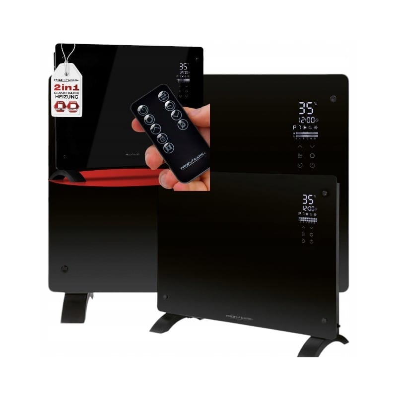 NAJWYŻSZEJ JAKOŚCIGRZEJNIK SZKLANYKONWEKTOROWYRENOMOWANEJ FIRMY PROFICAREMODEL: PC-GKH 3119 CZARNYOgrzewanie elektryczne pro ogrzewania mieszkań, garaży, szklarni, warsztatów i tym podobnych. Idealnie nadaje się do ogrzewania w mroźną zimę. Urządzenie posiada automatyczne rozpoznawanie otwarcia okna - automatyczne wyłączanie po otwarciu okna.Ciche ogrzewanie bez hałasu roboczego (0dB).2w1: GRZEJNIK WISZĄCY LUB STOJĄCYUważasz proste grzejniki za nieestetyczne zło konieczne Z ProfiCare GKH 3119 nie musi tak być. Nie musisz już wybierać między stylowym, nowoczesnym wnętrzem a komfortem. Ten cichy, prosty grzejnik jest stylowo czysty i elegancki, dzięki czemu nie będzie zawstydzał środka salonu. Dodatkowo, wysokiej jakości powierzchnia z hartowanego szkła zapewnia idealną dystrybucję ciepła. Wypełnia pomieszczenie komfortowym ciepłem, jednocześnie oszczędzając pieniądze i energię, ponieważ nie jest wymagający do uruchomienia.Cicho i bez wysiłkuW porównaniu do innych metod ogrzewania, ProfiCare GKH 3118 zużywa o połowę mniej energii. W przeciwieństwie do termometrów lub innych grzejników opalanych bezpośrednio, ogrzewa pomieszczenie bez nieprzyjemnych zapachów i przepływu powietrza. Ponadto nie wysusza powietrza ani nie spala tlenu. Działa również bezgłośnie. Dzięki temu jest hipoalergiczny i utrzymuje zdrowe powietrze w domu.Bezpieczeństwo przede wszystkimMaksymalną temperaturę baterii można łatwo ustawić w skali od 5 do 50 stopni. A jeśli w pobliżu będą przebywać dzieci lub zwierzęta, włącz blokadę przed dziećmi. Szczególnie w garażu, warsztacie lub szklarni docenisz ochronę przed zamarzaniem.Dostępne ogrzewanieCiesz się wygodą zdalnego sterowania i włączaj ogrzewanie bezpośrednio z kanapy lub łóżka. Dzięki timerowi i siedmiu wstępnie ustawionym programom nie będziesz musiał myśleć o włączeniu ogrzewania. Wielofunkcyjny wyświetlacz XXL pozwala również zdalnie sprawdzić, jak długo trwa ogrzewanie.Ciepła pobudkaNie przepadasz za nocnym ogrzewaniem, ale chciałbyś nie musieć rano wychodzić spod rozgrzanej kołdry W takim razie użyj timera. Po prostu ustaw go na trzydzieści minut przed alarmem, a obudzisz się w komfortowym cieple. Konwektor automatycznie utrzyma ciepło, a Ty będziesz mógł leniuchować lub relaksować się w komforcie i bez zmartwień.Przód urządzenia jest wykonany z bezpiecznego szkła. Dzięki elementowi grzejnemu w kształcie X-Shape bardzo szybko się nagrzewa.PARAMETRY TECHNICZNE:Wielofunkcyjny wyświetlacz XXL2 poziomy ogrzewania (1000/2000 W)Cyfrowa regulacja temperatury od 5 do 50°CUrządzenie posiada ochronę przed zamarzaniem24 godzinny timer,7 programów czasowychAutomatyczna regulacja temperatury.Zamek dziecięcy.Ochrona przed przegrzaniemW zestawie materiał montażowyZasilanie 230 V, 50 HzTo urządzenie nadaje się tylko pro dobrze izolowanych pomieszczeń lub pro okazjonalnego użytkuslimtex