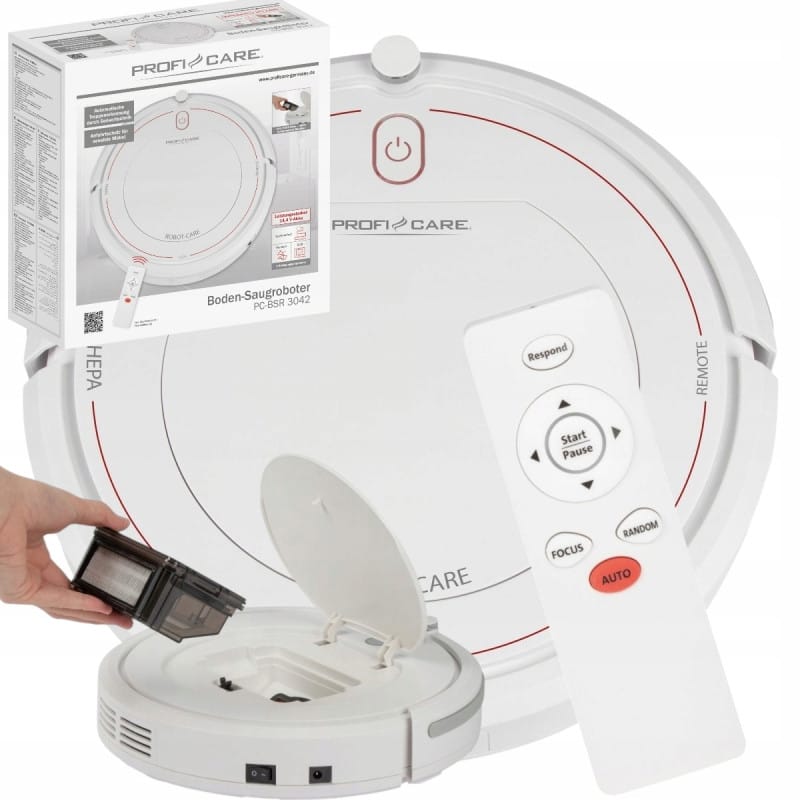 NAJWYŻSZEJ JAKOŚCIROBOT SPRZĄTAJĄCYODKURZACZ JEŻDŻĄCYRENOMOWANEJ FIRMY PROFICAREMODEL: PC-BSR 3042Odkurzacz samoczynny z obrotowymi, bocznymi szczotkami podłogowymi który samodzielnie odkurza podłogi we wszystkich pomieszczeniach usuwając kurz, okruchy i sierść.Odpowiedni do czyszczenia twardych podłóg i wykładzin z krótkim włosiem.Doskonały pomocnikRobot sprzątający który jest doskonałą alternatywą dla tradycyjnych odkurzaczy. Samodzielnie odkurza podłogi we wszystkich pomieszczeniach usuwając kurz, okruchy i sierśćWielofunkcyjny3 programy czyszczenia: czyszczenie wyrywkowe, czyszczenie punktowe, czyszczenie systematyczneWygodne sterowanieZdalne sterowanie przy pomocy pilota pozwala na włączenie i sterowanie urządzeniem.Idealny na prezentUrządzenie posiada eleganckie opakowanie, dzięki czemu idealnie sprawdzi się, jako prezent!Poziom hałasu: 61 dB - Ciche sprzątanieOdkurzacz automatyczny o niskim poziomie hałasu pozwoli łatwiej skupić się na wykonywanych czynnościach. Jeśli szczególnie cenisz sobie ciszę, lub wymagają jej Twoje obowiązki - warto zwrócić uwagę na ten parametr. Z drugiej strony - urządzenia pracujące głośniej mogą odznaczać się większą skutecznością sprzątania.Czas ładowania: 300 minutTyle czasu zajmie pełne naładowanie rozładowanego akumulatora. Urządzenie, które szybko się napełnia się energią, pozwoli sprawniej zareagować na nieprzewidziane sytuacje. Niemniej, odkurzacze automatyczne wymagające dłuższego ładowania, zwykle mogą pracować przez więcej czasu, a co za tym idzie - jednorazowo oczyścić większą powierzchnię.Półtorej godziny pracy odkurzaczaKażdy odkurzacz automatyczny to urządzenie akumulatorowe, które dysponuje baterią o określonych parametrach, co wpływa na maksymalny czas działania urządzenia. Im jest on dłuższy, tym lepiej. Ten model odkurzacza może działać bez przerwy nawet przez 90 minut, dzięki czemu z łatwością poodkurza mieszkanie lub niewielki dom. Możliwość odkurzenia całego lokum za jednym razem jest bardzo wygodna, gdyż proces odkurzania przebiega szybciej i jest mniej uciążliwy dla mieszkańców.Pojemnik na kurz: 300 mlTen parametr należy dobrać do powierzchni obszaru sprzątania oraz stopnia jego zanieczyszczenia. Większy pojemnik umożliwi długie jednorazowe sprzątanie. Jeśli odkurzacz posiada funkcję automatycznego opróżniania lub ma służyć do oczyszczania małych obszarów, rozmiar pojemnika na kurz nie będzie aż tak bardzo istotnym aspektem.Automatyczny powrót do bazyDobry odkurzacz automatyczny powinien być niemal bezobsługowy. Jednym z rozwiązań, które sprawiają, że odkurzacz działa z dużą dozą niezależności, jest automatyczny powrót do bazy. Urządzenie, gdy ulegnie rozładowaniu lub zakończy pracę, powróci do bazy i rozpocznie proces ładowania baterii. Dzięki takiemu rozwiązaniu nie potkniesz się nagle o odkurzacz, który pozostał w niespodziewanym miejscu. Funkcja automatycznego powrotu do bazy wpływa również na szybszą gotowość sprzętu do ponownej pracy – użytkownik nie musi pilnować stanu baterii ani zanosić urządzenia do bazy, gdyż sprzęt samodzielnie powróci do stacji ładowania. Sterowanie pilotemUstawienia tego robota sprzątającego można zmieniać za pomocą pilota. To wygodna i dobrze znana metoda komunikowania się z urządzeniami elektronicznymi. Sterowanie tym sposobem wyklucza konieczność schylania się do odkurzacza. Na obecności pilota skorzystają także osoby, które nie są zaznajomione ze schematem obsługi aplikacji mobilnych. Przyjazny zwierzętomObecność czworonoga w domu daje wiele radości, ale pozostawia też sporo sierści, np. osiadającej na dywanach. Odkurzacz wyposażony jest w system, który pomaga w pozbyciu się zalegających włosów i sierści. Może to być specjalna turboszczotka lub wydajna technologia, stworzona z myślą o pupilach. Filtr HEPAFiltr HEPA to bardzo skuteczny cząsteczkowy filtr, wykonany ze spiekanego szkła i nieprzepuszczający cząsteczek większych niż 0,3 µm, dzięki czemu jest idealnym wyborem do domów, w którcy mieszkają alergicy lub małe dzieci. Filtr HEPA potrafi zatrzymać zdecydowaną większość cząsteczek zanieczyszczeń mechanicznych, bakterii, grzybów i niektórych wirusów. Większość filtrów tego typu jest jednorazowego użytku – aby były skuteczne, należy pamiętać o ich regularnej wymianie. Odkurzacz bezprzewodowyOdkurzacz bezprzewodowy zasilany jest przez akumulator i nie potrzebuje stałego dostępu do prądu. Taki odkurzacz charakteryzuje się dużą mobilnością, należy jednak pamiętać o jego regularnym ładowaniu.ProfiCare PC-BSR 3042 to robot sprzątający który jest doskonałą alternatywą dla tradycyjnych odkurzaczy. Samodzielnie odkurza podłogi we wszystkich pomieszczeniach usuwając kurz, okruchy i sierść. Odkurzacz jest odpowiedni do czyszczenia twardych podłóg i wykładzin z krótkim włosiem. Dzięki gumowanym kółkom na zawieszeniu sprężynowym sprawdzi się również na delikatnych podłogach.Urządzenie posiada 3 programy czyszczenia: czyszczenie wyrywkowe, czyszczenie punktowe oraz czyszczenie systematyczne. Bardzo mała wysokość urządzenia (około 7.5 cm), zapewniająca możliwość czyszczenia pod meblami. Zdalne sterowanie przy pomocy pilota pozwala na włączenie i sterowanie urządzeniem. Łatwy w opróżnianiu pojemnik na kurz o pojemności 400 ml oraz filtr HEPA zapewniają czystą obsługę oraz atmosferę podczas sprzątania.Akumulator o pojemności 1500 mAh zapewnia około 90 minut pracy - pełne naładowanie trwa około 5h. Automatyczne wykrywanie schodów oraz przeszkód dzięki technologii czujników chroni urządzenie przed uszkodzeniem.PARAMETRY TECHNICZNE:Odkurzacz samoczynny z obrotowymi szczotkami bocznymiSamodzielnie odkurza podłogi we wszystkich pomieszczeniach usuwając kurz, okruchy i sierśćOdpowiedni do czyszczenia twardyc