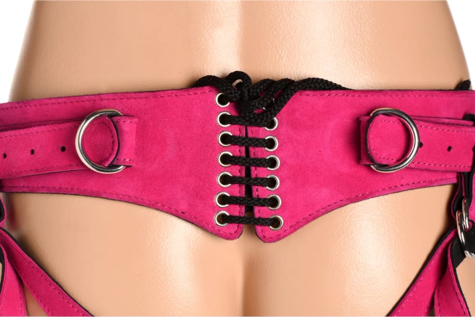 - Tył uprzęży posiada stylowe wiązanie gorsetowe na nylonowe sznurowadła, pozwalające na precyzyjne dopasowanie do ciała.