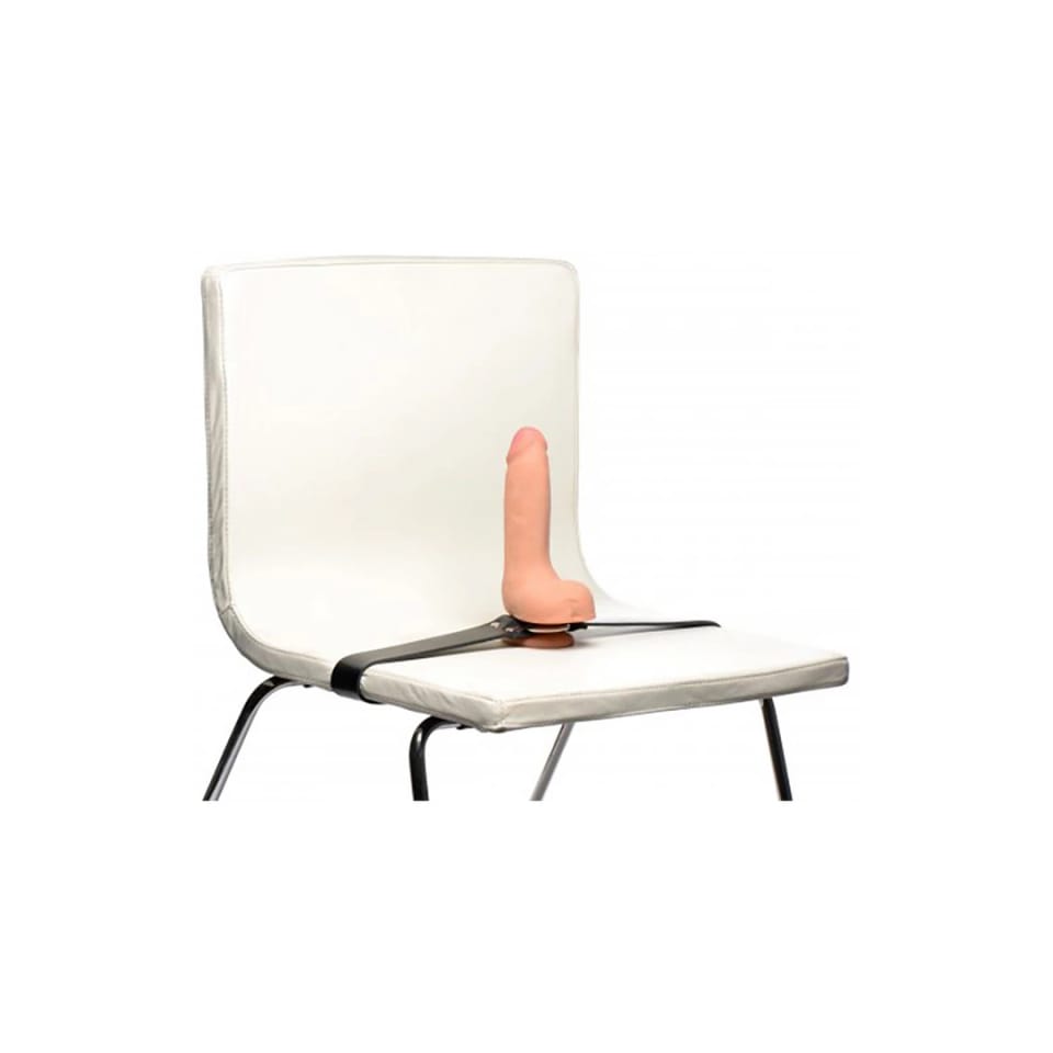 Uprząż wykonano z wysokiej jakości skory PU, będącej materiałem przyjaznym dla wegan, ktory gwarantuje trwałość, łatwość utrzymania w czystości oraz komfort użytkowania. Metalowy pierścień uszczelniający jest dopasowany do większości akcesoriow z szeroką podstawą, a system regulowanych paskow pozwala na indywidualne dostosowanie obwodu – od 34 do 45 cali – dzięki czemu uprząż sprawdzi się zarowno na osobie, jak i na przedmiotach, takich jak krzesła.