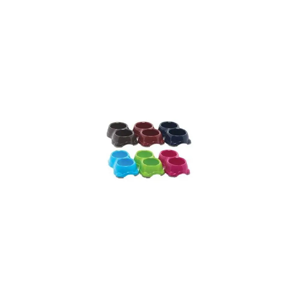 Podwójna miska plastikowa z gumowymi zakończeniami, które sprawiają że miska nie przesuwa się podczas jedzenia przez czworonoga.