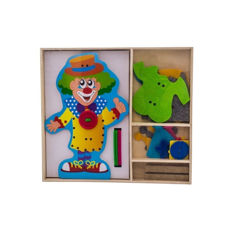 Drewniany Klaun to super zabawka dla dziecka. Dzięki niej twój maluszek nauczy się dopasowywać oraz nawlekać różne elementy tj.: guziki, ubranka. Zabawka rozwija koordynację wzrokowo ruchową ćwicząc precyzję ruchu. Wymiary: 26x17 cm Ilość elementów: 5 kolorowych ubranek 4 czapki 6 guzików 2 sznurówki 1 klaun 1 stojak Wiek: 18m+