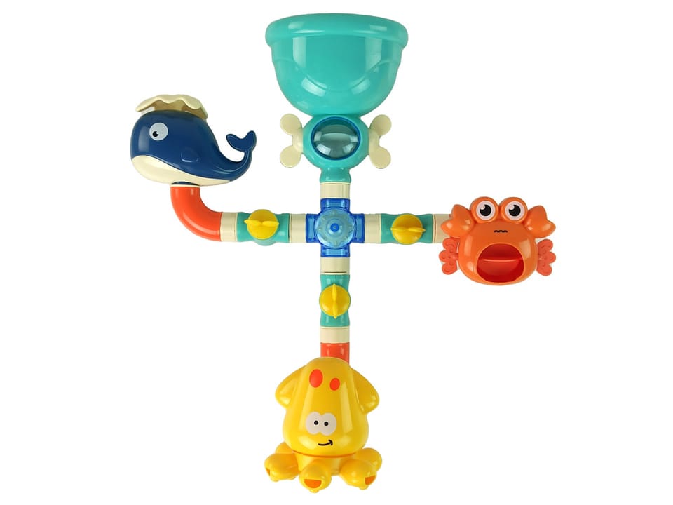 Zabawka zawiera trzy urocze stworzenia morskie: granatowego wieloryba, czerwonego kraba i żółtą ośmiornicę. Jak dostarczają one rozrywki? To proste! Wystarczy napełnić górny niebieski zbiorniczek wodą, aby zobaczyć, jak woda spływa przez różne elementy zabawki.