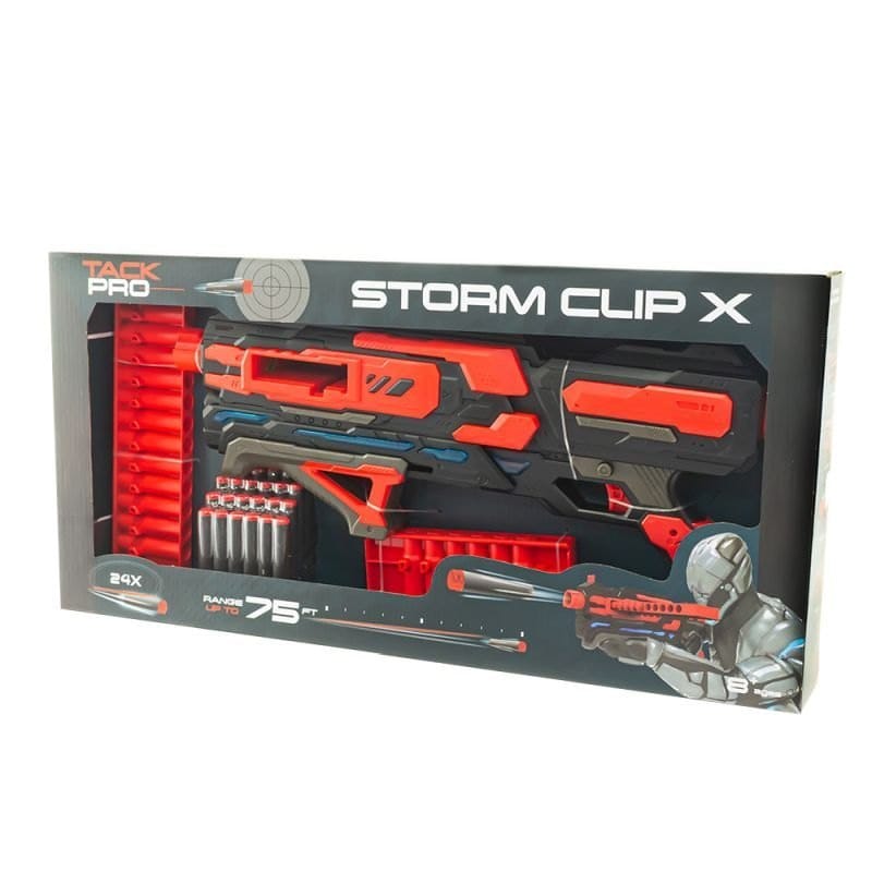 Precyzyjny pistolet na piankową amunicję wykonany jest z plastiku. Jego budowa przypomina konstrukcję prawdziwej broni, jednak jest bardzo bezpieczna - nie posiada ostrych zakończeń i elementów. W zestawie dołączone są zwykłe strzałki piankowe. Wyrzutnia pocisków pneumatyczna. Zestaw zawiera: - pistolet - 2 magazynki - strzałki piankowe - 24 sztuk Rozmiar zabawki: 49 x 20 cm Wymiary opakowania: 60 x 29 x 8cm Wiek: 8+