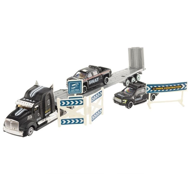 Laweta SWAT specjalna jednostka policji. Wieloelementowy zestaw będzie spełnieniem marzeń małych sympatyków. Bądź czujny i pilnuj porządku w mieście z samochodem jednostki specjalnej SWAT! Zestaw zawiera: -2 samochody -tir z lawetą -znaki ostrzegawcze -zapora Wiek: 3+ Rozmiar zabawek: od 2 cm do 22 cm Rozmiar opakowania: 34 x 15 x 5 cm