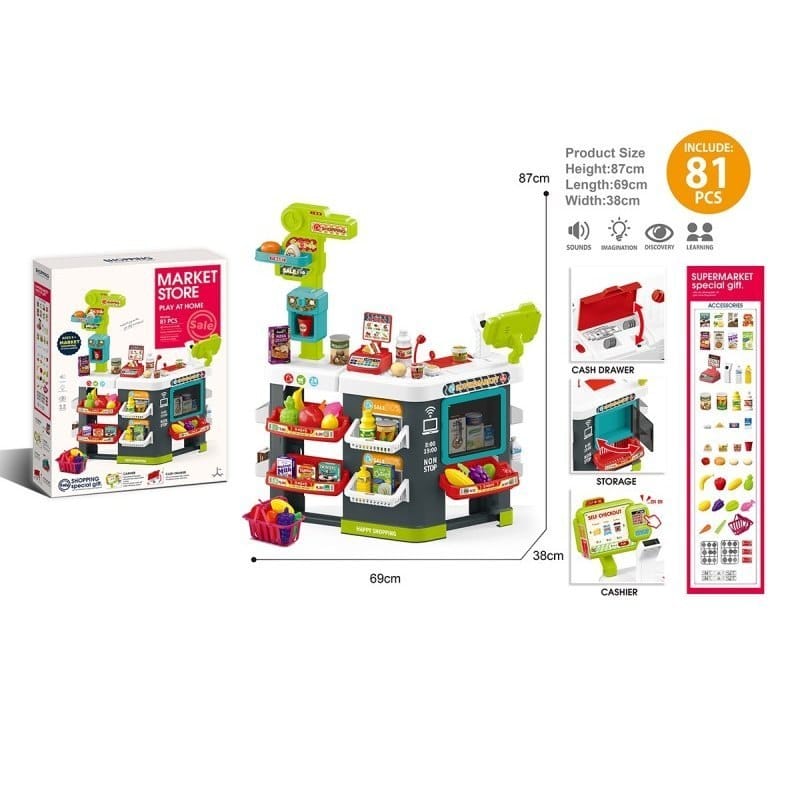 Stragan EBZ922-202 - Idealna Zabawa w Zakupy! Stragan Supermarket EBZ922-202 to doskonały zestaw dla dzieci, które uwielbiają bawić się w sklep. Wyposażony w realistyczne akcesoria, świetlne i dźwiękowe efekty oraz bogaty asortyment produktów, umożliwia maluchom zanurzenie się w fascynującym świecie zakupów i handlu. Zabawa rozwija wyobraźnię, umiejętności społeczne oraz koordynację. Bogata zawartość zestawu: Realistyczne akcesoria sklepowe: Kasa fiskalna: Z funkcjami dźwiękowymi, które dodają realizmu zabawie. Zamykana kasa na monety i banknoty: Idealna do przechowywania gotówki i nauki liczenia. Waga sklepowa: Pozwala dzieciom „ważyć" produkty, jak prawdziwi sprzedawcy. Koszyk na zakupy: Zachęca do odgrywania ról klienta i sprzedawcy. Lodówka: Dla produktów wymagających chłodzenia - maluchy poczują się jak w prawdziwym sklepie! Liczne produkty spożywcze: Warzywa i owoce plastikowe: Kolorowe i trwałe, idealne do kreatywnej zabawy. Produkty w kartonikach: Małe opakowania imitujące rzeczywiste artykuły spożywcze. Korzyści z zabawy: Rozwój wyobraźni i kreatywności: Maluchy mogą tworzyć własne scenariusze zakupów i zarządzania sklepem. Nauka liczenia: Dzięki kasie i gotówce dzieci uczą się podstaw matematyki i obsługi pieniędzy. Rozwój społeczny: Zabawa w grupie uczy współpracy, komunikacji i odgrywania ról. Zdolności manualne: Zabawa akcesoriami i produktami wspiera rozwój precyzji ruchów. Edukacyjna rozrywka: Wprowadza dzieci w świat handlu, zachęcając do poznawania nazw produktów i zasad zakupów. Dlaczego warto wybrać Stragan EBZ922-202? Realistyczne elementy i funkcje wzbogacające zabawę. Bogaty asortyment, który zapewni długie godziny angażującej zabawy. Doskonały sposób na rozwijanie kreatywności, naukę podstawowych umiejętności matematycznych i rozwój społeczny. Zestaw Stragan Supermarket EBZ922-202 to świetny pomysł na prezent, który zapewni dzieciom edukacyjną i ekscytującą zabawę! Dane techniczne: Wiek: 3+ Wymiary pudełka: 73 x 57 x 12 cm Wymiary straganu po złożeniu: 87 x 69 x 38 cm Zawartość zestawu: Kasa fiskalna z efektami świetlnymi i dźwiękowymi. Zamykana kasa na pieniądze. Waga sklepowa. Koszyk na zakupy. Lodówka na chłodzone produkty. Liczne produkty spożywcze Zestaw składający się z aż 81 elementów.