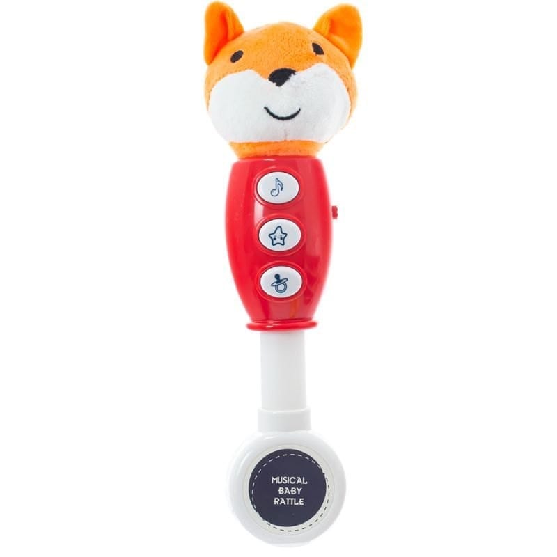 Zabawka pałka dźwiękowa - Lisek. Przeznaczona dla dzieci powyżej 3 miesiąca życia. Wykonana z najwyżej jakości materiału, główka zabawki z miękkiego weluru, moduł grający oraz wygodna rączka do trzymania. Przyjemne dźwięki rozbudzą wyobraźnię Twojej pociechy oraz zaciekawią. Zestaw zawiera: Zwierzątko na uchwycie z modułem grającym. Rozmiar zabawki: 27 x 7 cm Rozmiar opakowania: 31 x 12 x 8 cm Wiek: 3m + Zasilanie: 2x bateria typu AA 1.5V (brak w zestawie)