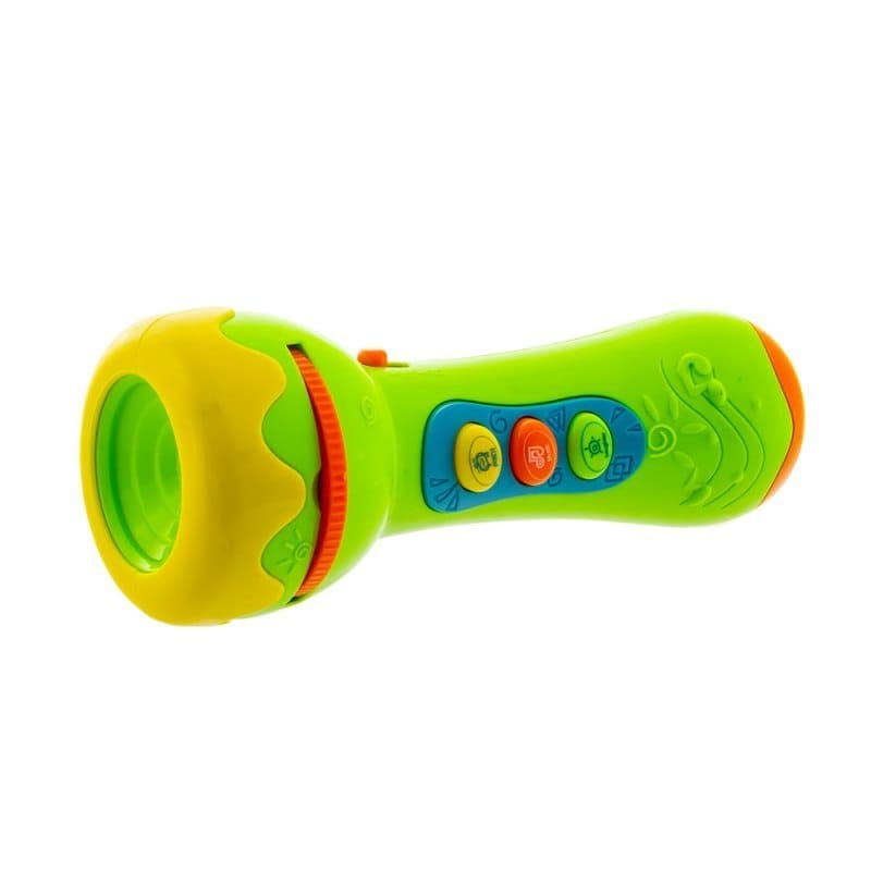 Zabawka latarka projektor. Rozwija u dziecka koordynację wzrokowo-ruchową poprzez zabawę. Zabawka posiada migające światełka w czasie zabawy oraz wydaje dźwięki i odgrywa melodie. Zabawka bezpieczna i nietoksyczna Produkt przeznaczony dla dzieci powyżej trzeciego roku życia. Dostępne kolory: zielony, żółty, pomarańczowy Wymiary opakowania: Wysokość: 21cm Szerokość: 8,5cm Długość: 27cm Wymiary: 16 cm Baterie. 3x 1.5V AA Brak baterii w zestawie.