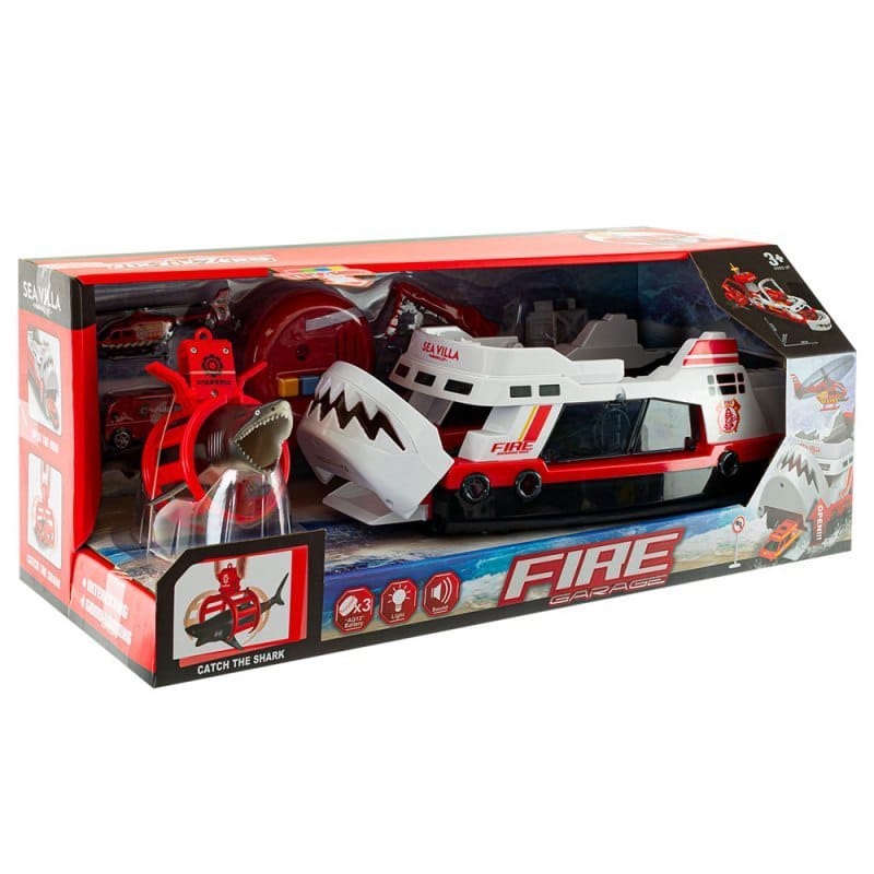 Na wysięgniku po boku łodzi znajduje się pułapka na groźne rekiny, co dodaje jeszcze więcej ekscytacji do zabawy. Zestaw zawiera również 2 małe pojazdy: wóz strażacki oraz helikopter, które umożliwiają jeszcze większe akcje ratunkowe.