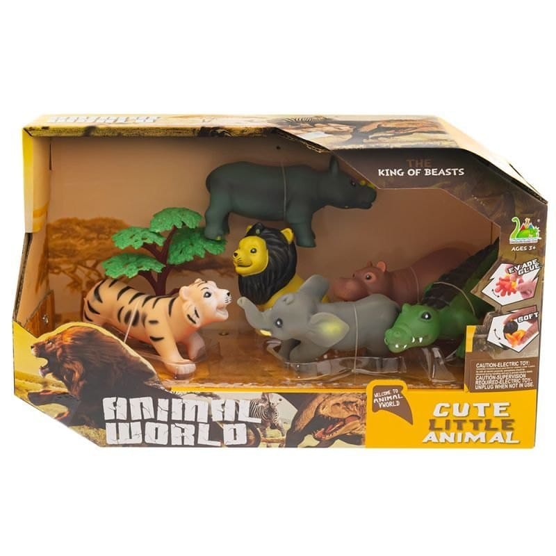 Zabawka zestaw zwierzątek- safari. Zestaw gumowych miękkich zwierzątek w pięknych pastelowych kolorach z pewnością zachwyci każdego maluszka. Zestaw zwierzątek z safari rozbudzi wyobraźnię do kreowania, a dziecięcy pokoik zamieni się w prawdziwe safari. Figurki wykonane są z najwyższej jakości trwałej i bezpiecznej miękkiej gumy. W zestawie: -tygrys -lew -słoń -hipopotam -nosorożec -krokodyl -roślina Wymiary: Opakowanie: 30x18x12 cm Zabawka: 11x5x2 cm (wymiary jednej figurki) Wiek: 3+