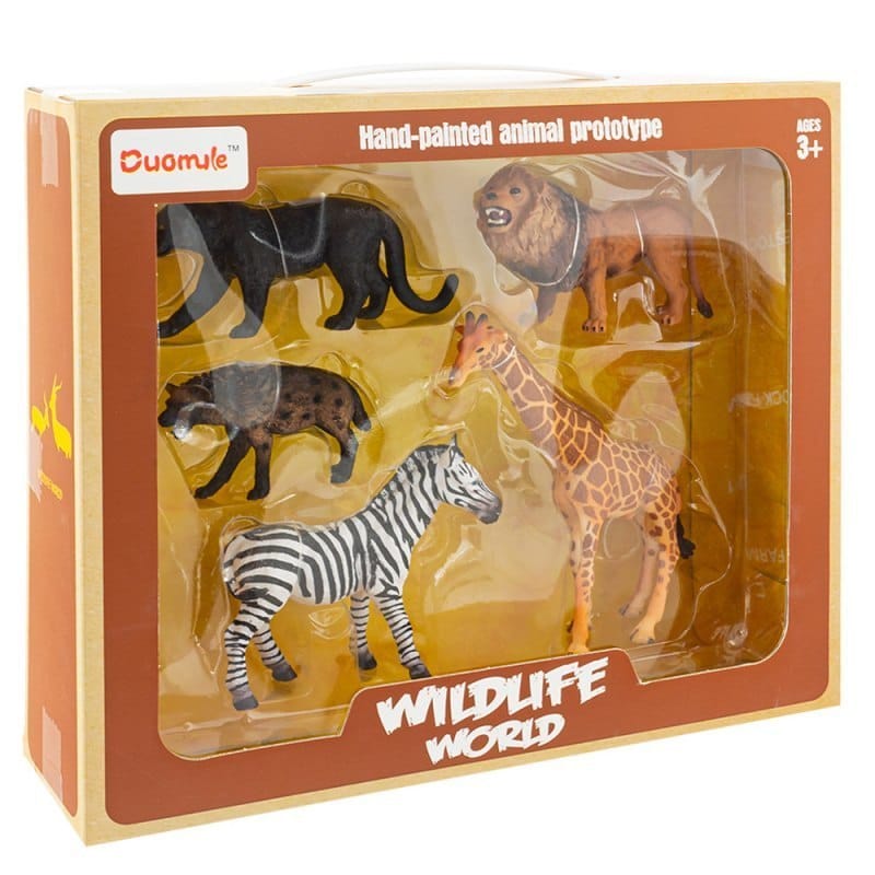Piękny zestaw ręcznie malowanych zwierząt. Zwierzęta są bardzo realistycznie odwzorowane i malowane ze starannością, aby zachować wierny wygląd. Farba jest bardzo trwała i bezpieczna dla dziecka i można się tą zabawką bezpiecznie bawić. W skład zestawy wchodzą: - Pantera 12 cm - Lew 11cm - Żyrafa 14.5 cm - Zebra 10.5 cm - Hiena 8 cm Wymiary: Pudełko: 30 x 26 x 8cm Wiek: 3+