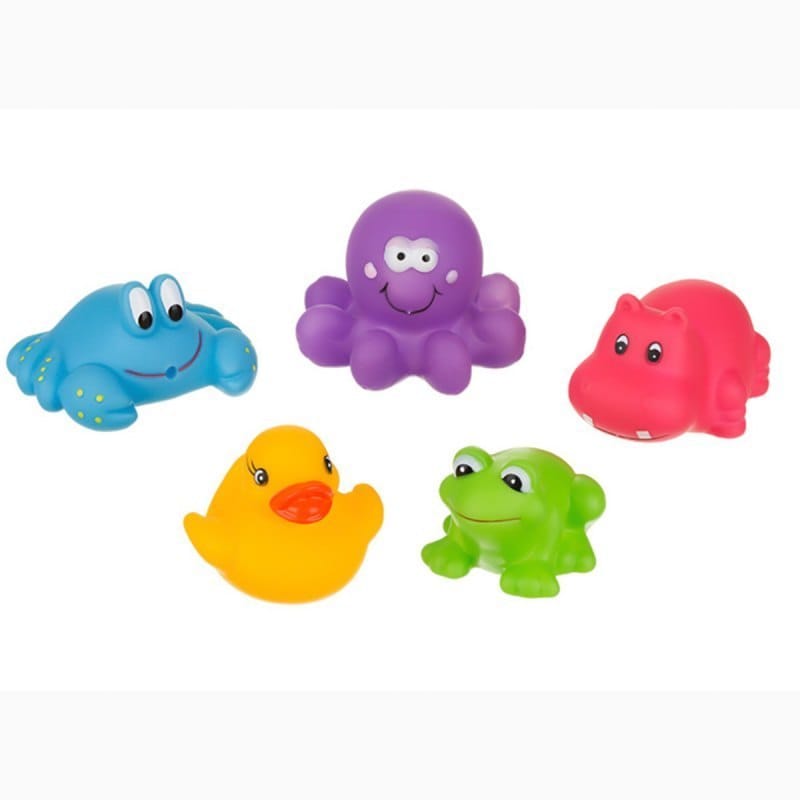Zestaw 5 ślicznych, kolorowych zabawek do kąpieli. Idealne do zabawy w kąpieli Wyjątkowe i unikalne wzornictwo. Śliczna kolorystyka przyciąga uwagę maluchów. Dziecko poprzez zabawę poznaje otaczający go świat. Nasz zestaw składa się z 5 różnych zwierzaków: - kaczuszka, krab, hipcio, żabka, ośmiorniczka. Każda zabawka posiada otwór, przez który można tryskać wodą Zaokrąglone kształty gwarantują bezpieczeństwo podczas zabawy. Teraz kąpiel będzie super przygodą z gumowymi przyjaciółmi! Wykonane z bezpiecznych, wysokiej jakości materiałów, nie zawierają bisfenolu A. Wielkość zwierzaków od 4 do 5 cm.