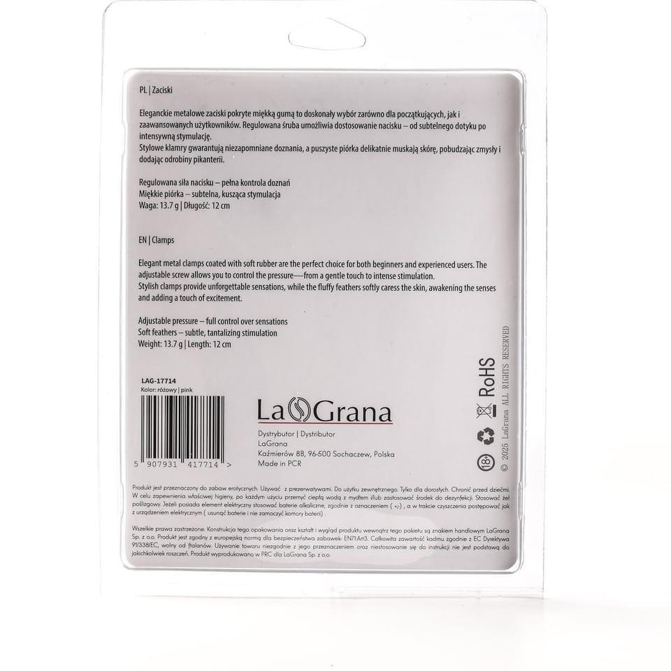 ZaciskiEleganckie metalowe zaciski pokryte miękką gumą to doskonały wybór zarówno dla początkujących, jak i zaawansowanych użytkowników. Regulowana śruba umożliwia dostosowanie nacisku – od subtelnego dotyku po intensywną stymulację.Stylowe klamry gwarantują niezapomniane doznania, a puszyste piórka delikatnie muskają skórę, pobudzając zmysły i dodając odrobiny pikanterii.Regulowana siła nacisku – pełna kontrola doznańMiękkie piórka – subtelna, kusząca stymulacjaWaga: 13.7 g | Długość: 12 cm
