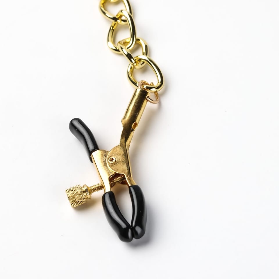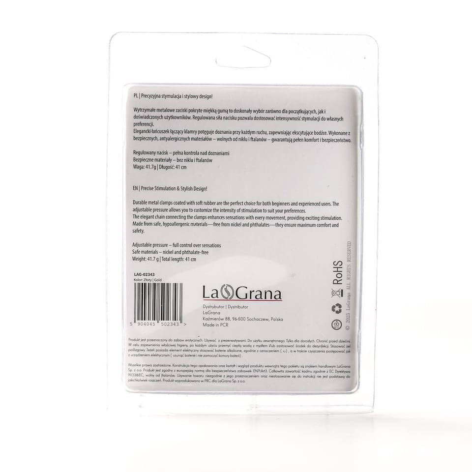 Precyzyjna stymulacja i stylowy design!Wytrzymałe metalowe zaciski pokryte miękką gumą to doskonały wybór zarówno dla początkujących, jak i doświadczonych użytkowników. Regulowana siła nacisku pozwala dostosować intensywność stymulacji do własnych preferencji.Elegancki łańcuszek łączący klamry potęguje doznania przy każdym ruchu, zapewniając ekscytujące bodźce. Wykonane z bezpiecznych, antyalergicznych materiałów – wolnych od niklu i ftalanów – gwarantują pełen komfort i bezpieczeństwo.Regulowany nacisk – pełna kontrola nad doznaniamiBezpieczne materiały – bez niklu i ftalanówWaga: 41.7g | Długość: 41 cm