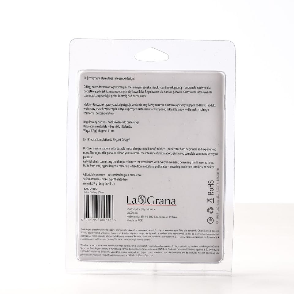 Precyzyjna stymulacja i elegancki design!Odkryj nowe doznania z wytrzymałymi metalowymi zaciskami pokrytymi miękką gumą – doskonałe zarówno dla początkujących, jak i zaawansowanych użytkowników. Regulowana siła nacisku pozwala dostosować intensywność stymulacji, zapewniając pełną kontrolę nad doznaniami.Stylowy łańcuszek łączący zaciski potęguje wrażenia przy każdym ruchu, dostarczając ekscytujących bodźców. Produkt wykonany jest z bezpiecznych, antyalergicznych materiałów – wolnych od niklu i ftalanów – dla maksymalnego komfortu i bezpieczeństwa.Regulowany nacisk – dopasowanie do preferencjiBezpieczne materiały – bez niklu i ftalanówWaga: 37 g | długość: 41 cm