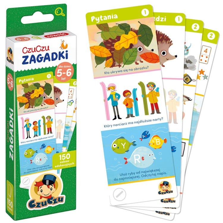 CzuCzu Zagadki czekają na młodych odkrywców!Poręczna edukacyjna książeczka na śrubie zawiera aż 150 obrazkowych pytań i odpowiedzi o tematyce doskonałej dla pięciolatków. Ciekawe zadania i łamigłówki rozwijają myślenie, spostrzegawczość i kreatywność oraz inspirują do zdobywania i utrwalania wiedzy o świecie.Wyjątkowa cecha: Mnóstwo wiedzy i zabawy w poręcznym formacie.Bawcie się i doskonalcie różne umiejętności.CzuCzu przepis na edukacyjną zabawę: