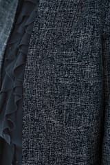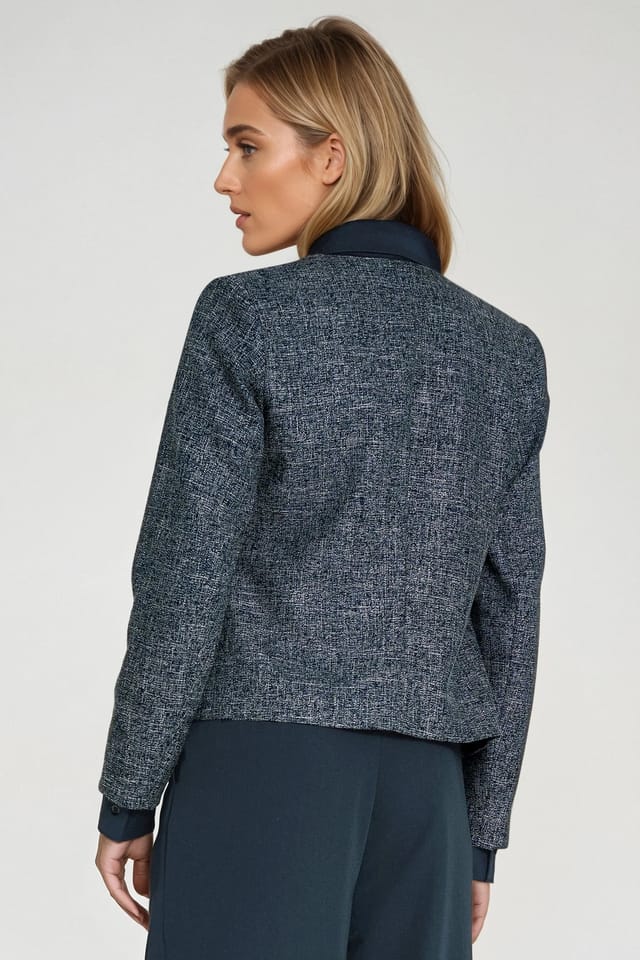 Krój regular. Krótka, pudełkowa forma. Materiał o melanżowej fakturze i niejednolitym kolorze. Bez zapięcia. Poduszki na ramionach. Posiada podszewkę. Skład: 70% poliester, 27% rayon, 3% spandex Podszewka: 100% poliester Modelka na zdjęciu ma 176 cm wzrostu i ma sobie rozmiar 36.