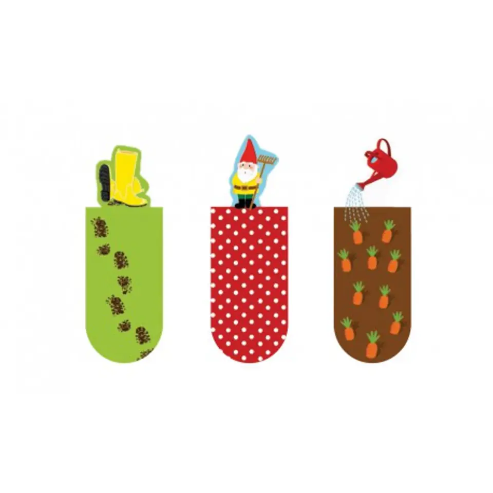 Zakładki magnetyczne - Ogród Pięknie ilustrowane zakładki z wystającymi, ozdobnymi elementami. Idealne do zaznaczania ostatnio czytanych lub ulubionych fragmentów książek. Doskonale sprawdzają się w indeksowaniu notatek, dokumentów w biurze, w szkole i w domu. Każdy zestaw zawiera 3 zakładki o różnych wzorach. Wymiary : 5,5 cm, 2 cm. 31070