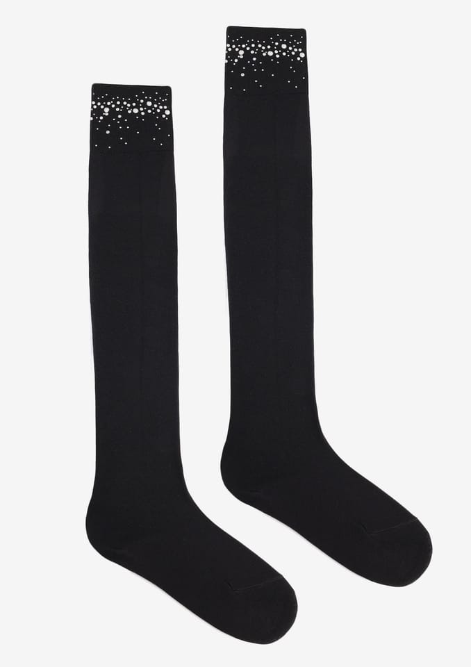 Klasyczne zakolanówki bawełniane ozdobione kryształkami. Posiadają nieuciskający ściągacz. Skład: 85% bawełna, 13% poliamid, 2% elastan.