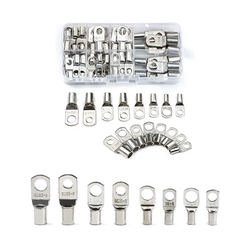 Zestaw 60 zakończeń oczkowych na kabelNajwyższej jakości produkt miedziany cynowany, przyjazny dla środowiska, bezpieczny w użyciuRóżne końcówki zaciskane zapakowane w podręczne etui z przegródkamiSpecyfikacja: materiał: miedź cynowana kolor: srebrny ilość: 60 sztuk / 1 zestawPaczka zawiera: 5 sztuk x zaciski SC25-8 (szerokość otworu na przewód 7mm, otwór na śrubę 8,5mm) 5 sztuk x zaciski SC25-6 (szerokość otworu na przewód 7mm, otwór na śrubę 6,5mm) 5 sztuk x zaciski SC16-8 (szerokość otworu na przewód 6mm, otwór na śrubę 8,5mm) 5 sztuk x zaciski SC16-6 (szerokość otworu na przewód 6mm, otwór na śrubę 6,5mm) 10 sztuk x zaciski SC10-8 (szerokość otworu na przewód 5,4mm, otwór na śrubę 8,5mm) 10 sztuk x zaciski SC10-6 (szerokość otworu na przewód 5,4mm, otwór na śrubę 6,5mm) 10 sztuk x zaciski SC6-8 (szerokość otworu na przewód 4,1mm, otwór na śrubę 8,5mm) 10 sztuk x zaciski SC6-6 (szerokość otworu na przewód 4,1mm, otwór na śrubę 6,5mm)